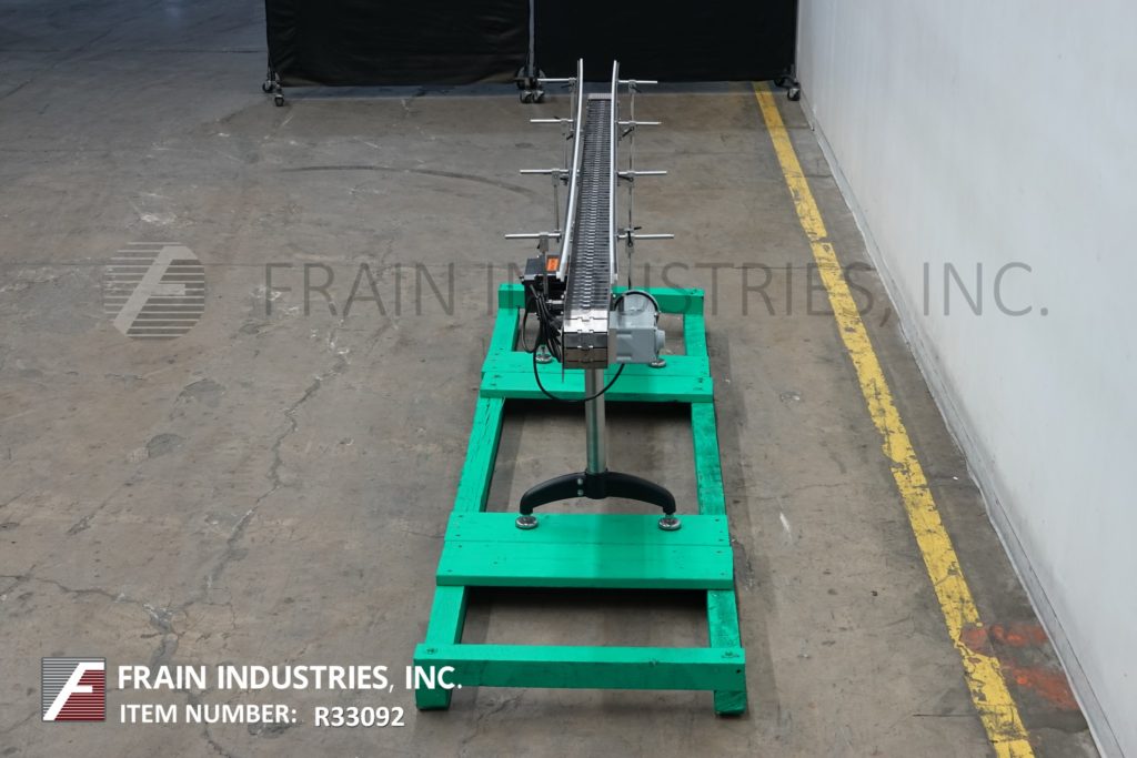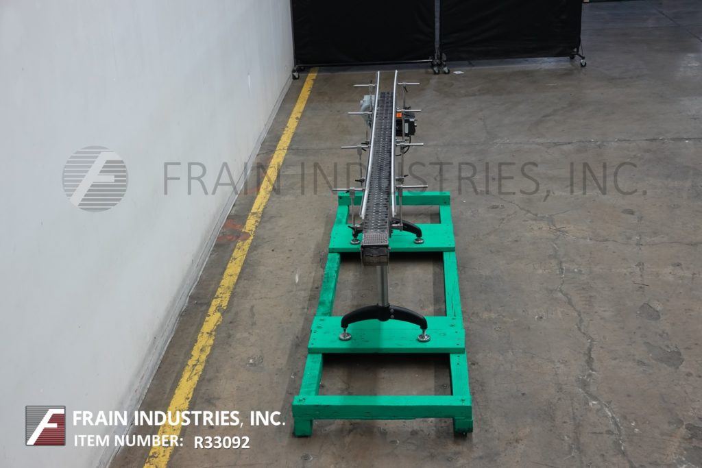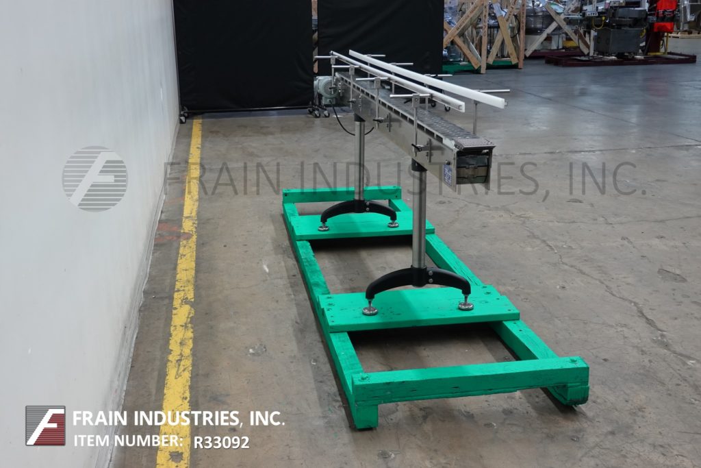 Nercon, 7¾" wide x 150" long stainless steel table top conveyor. Equipped with 7¾" wide and 150" long plastic slip roller style belt powered by a 1Hp drive, adjustable guide rails and mounted on adjustable legs with an infeed / discharge range of 30" – 36".