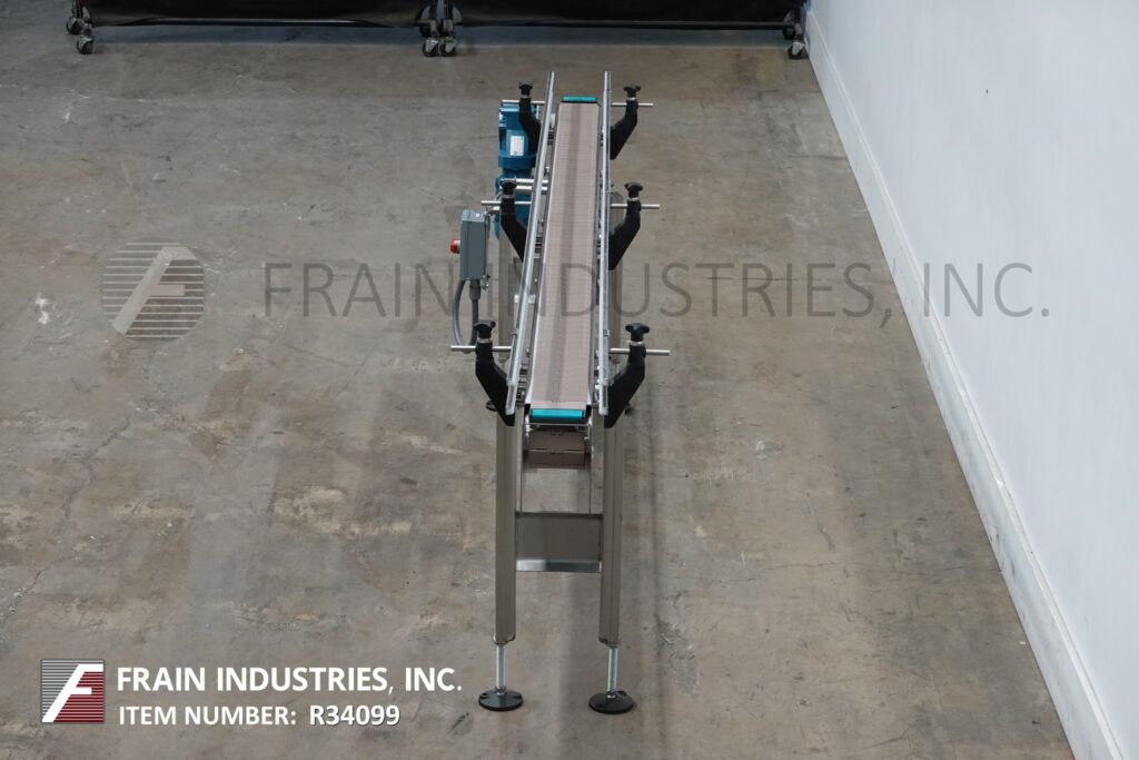 BMI stainless steel frame belt conveyor. Equipped with variable speed controler, 4½" wide x 56" long stainless steel table top product conveyor belt, adjustable guide rails and has 31" to 37" in feed and discharge height range. Mounted on (4) leg stainless steel leg frame with leveling pads.