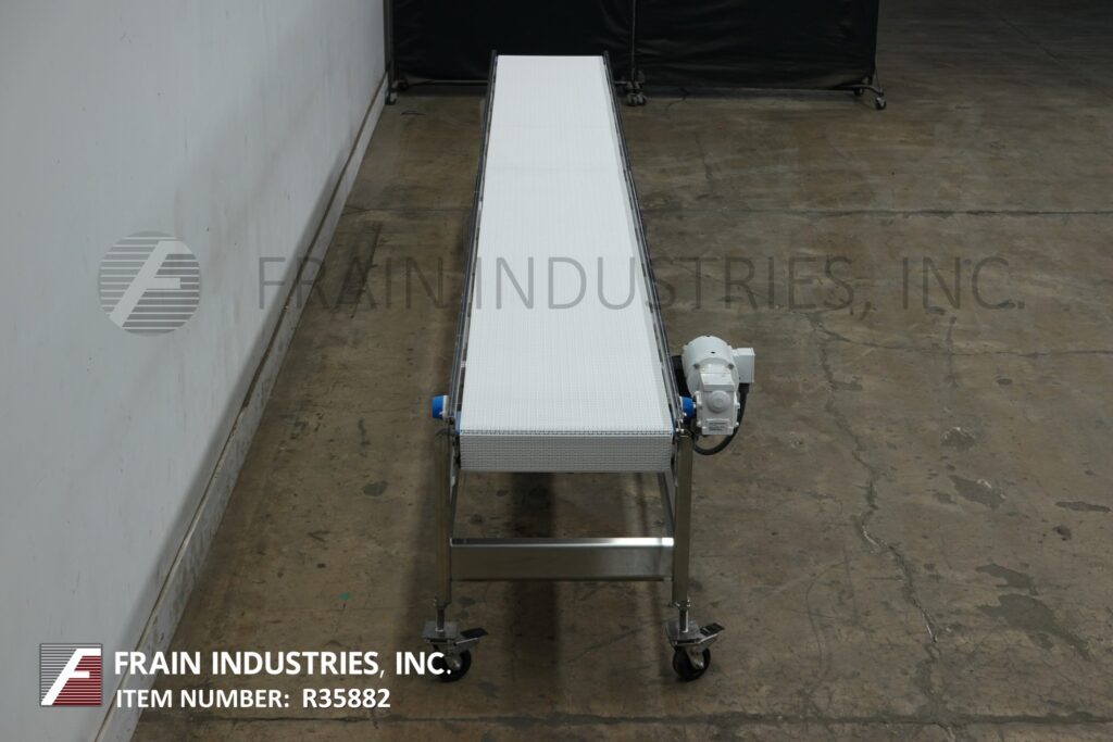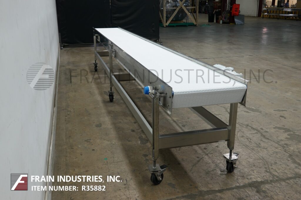 16" wide x 146" long stainless steel table top conveyor. 16" wide and 146" long Intralox style belt has an infeed / discharge height of 34½" with a ½ hp drive, variable speed control and mounted on (6) legs with leveling pads.