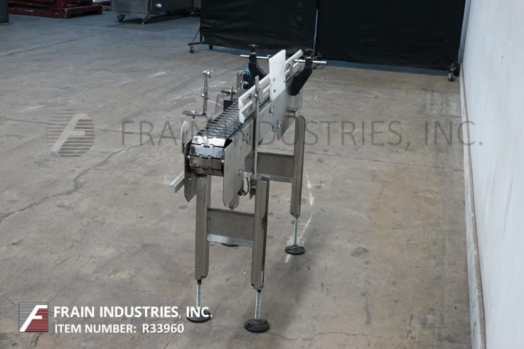 BMI stainless steel frame belt conveyor. Equipped with variable speed controler, 4½" wide x 56" long stainless steel table top product conveyor belt, adjustable guide rails and has 31" to 37" in feed and discharge height range. Mounted on (4) leg stainless steel leg frame with leveling pads.