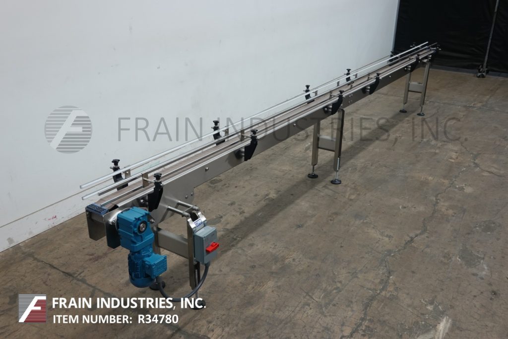BMI stainless steel frame belt conveyor. Equipped with 4½" wide x 234" long Delrin table top product conveyor belt, adjustable guide rails and has 31" to 37" in feed and discharge height range. Powered by a ½ HP drive with a variable speed controller. Mounted on stainless steel leg frame with leveling pads.