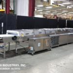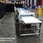 Morcos Machinery Model STKK24, 24 inch wide x 24 feet long convection cooling tunnel with number of product per hour – depending on materials and application. Equipped with stainless steel frame and cladding contact parts, 3 foot In feed table with adjustable approach edge, 24" wide x 24′ long pneopreme product belt, has its own motor drive, centering device with automatic belt tracking and tensioning, drive station with speed inverter and spring loaded scrapers for roller self cleaning. 8 section tunnel with hinged gas spring assit flip up covers, with temperature gauges and height up to 3½". Built in air cooling units one unit for each zone (1) complete 3.5 Kw cooling system with humidity control and cooling air is delivered in loops by forced cold air streams through twin blowers with (2) independent adjustable cooling zones, cooling compressor, air cooled condenser, with frequency inverter and evaporator. Control panel has blower and belt on / off and speed controls with e-stops. Mounted on heavy duty frame.