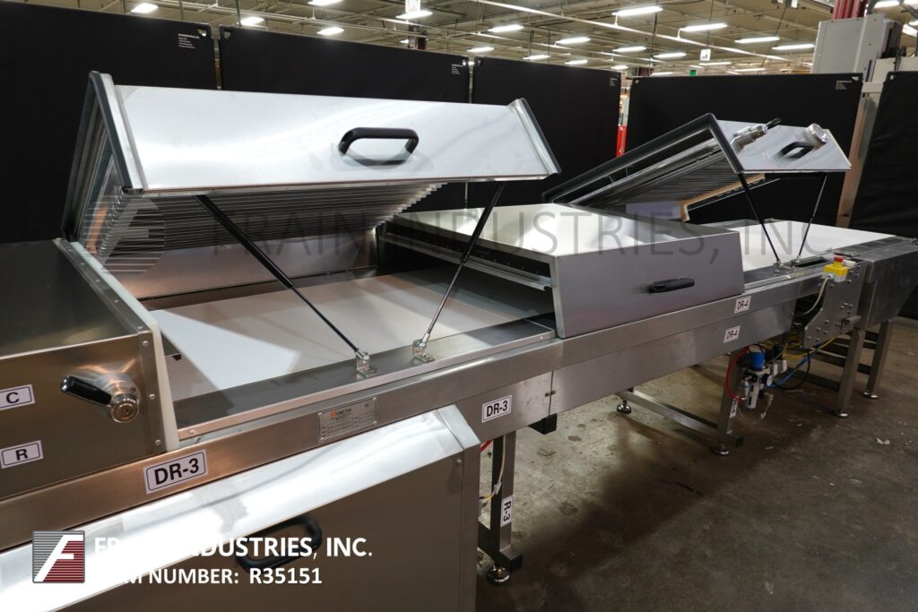 ADE, Air Draulic Eng. Model 99/195, Water cooled, stainless steel, cooling tunnel with temperatures and number of product per hour – depending on materials, application and machine configuration. Equipped with 60" wide x 9" high aperture and has (2) 96" long stainless steel cooling chambers with (2) easy access side doors (1) each side with 48" wide x 228" long table top conveyor belt, has 33" to 36" in feed and discharge height range. (2) 1" NPT connections for chilled water supply. Control panel has A/B PLC, (2) Honeywell temperture controls for cooling tunnel zones and (1) Watlow temperture control for heating zone. Includes on / off switches for tunnel #1 and tunnel #2, lights and heater, master start / stop and tunnel conveyor start / stop and e-stop push button controls. Mounted on heavy duty frame.
