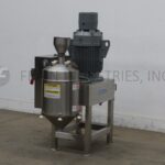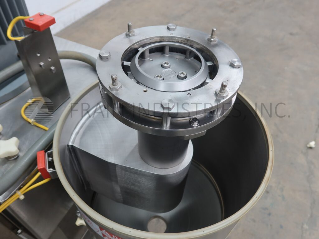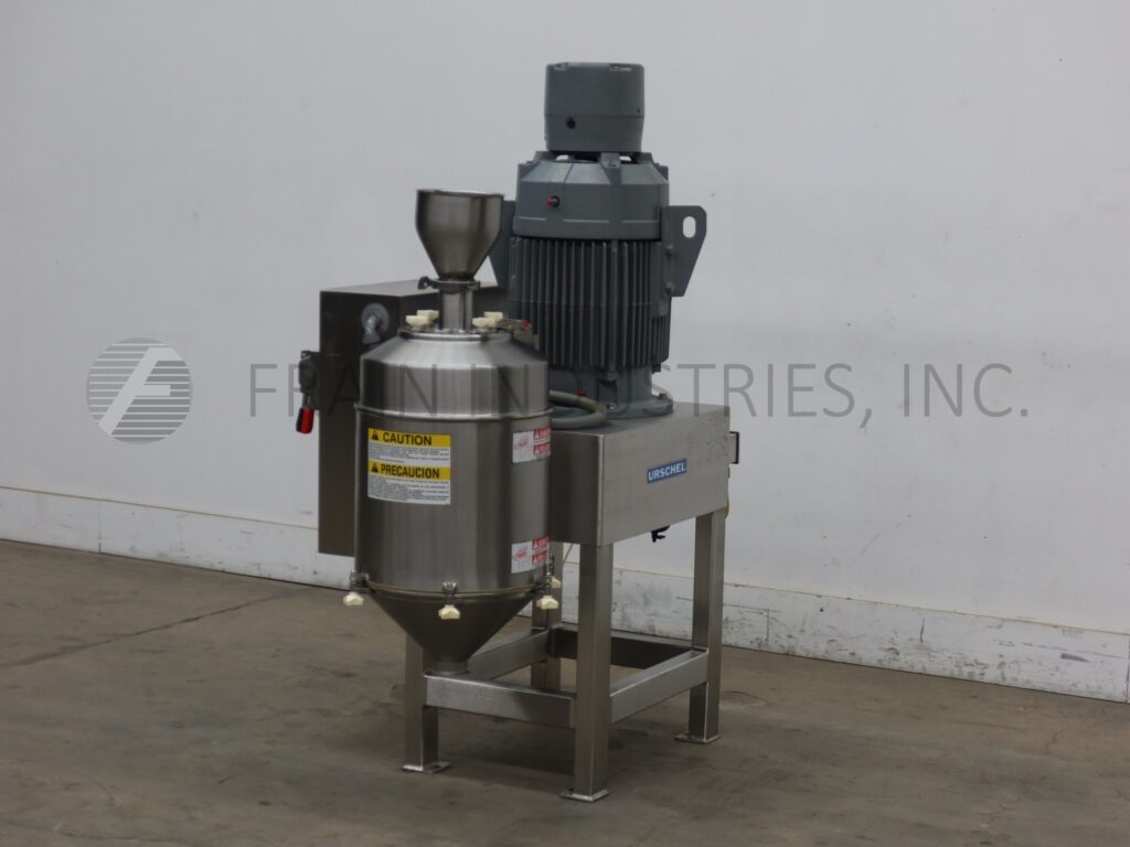 Urschel, Model 1700 Comitrol, stainless steel, reduction mill for free flowing dry and semi-dry product with number of pounds of product per hour – depending on materials and application. Equipped with 7½" ID x 8" Deep cone product hopper with 3" ID / 3½" OD Tri-clamp feed throat, 3" ID / 3½" OD Tri-clamp product discharge with 12" floor clearance, oil mist assembly for lubricating bearings during operation. Powered by a 30 Hp drive. Control panel has push botton start / stop controls. Mounted on stainless steel base. Operations include communiting, granulating, milling, slicing, liquifying, dispersing, and pureeing. Change parts required per application.
