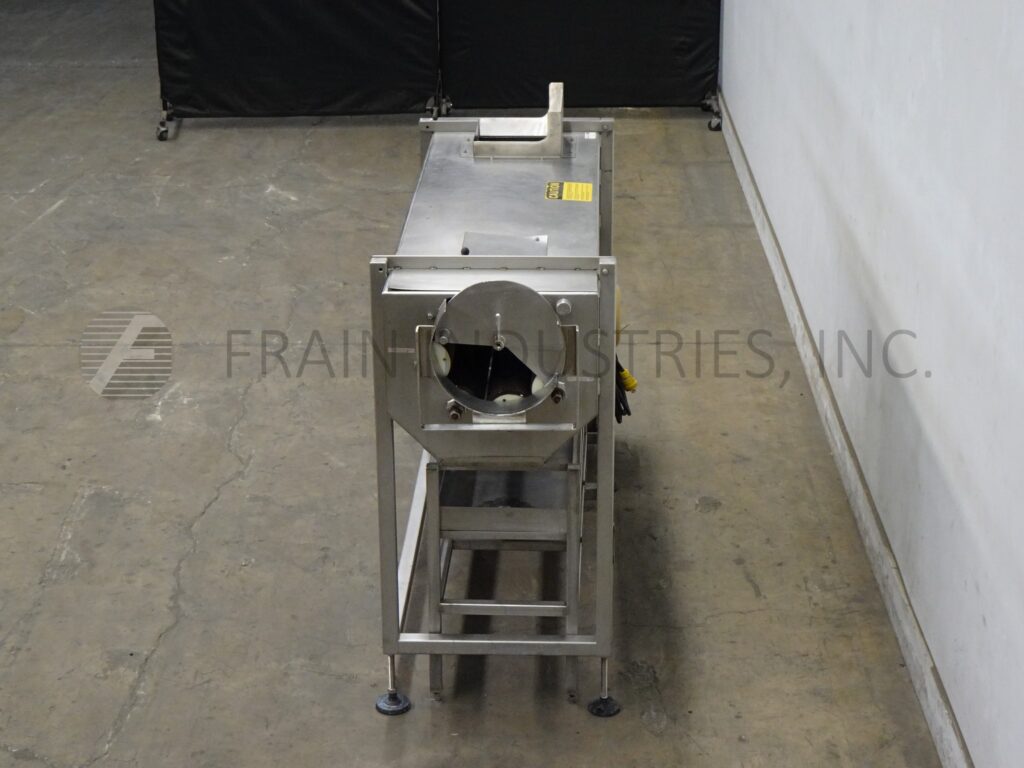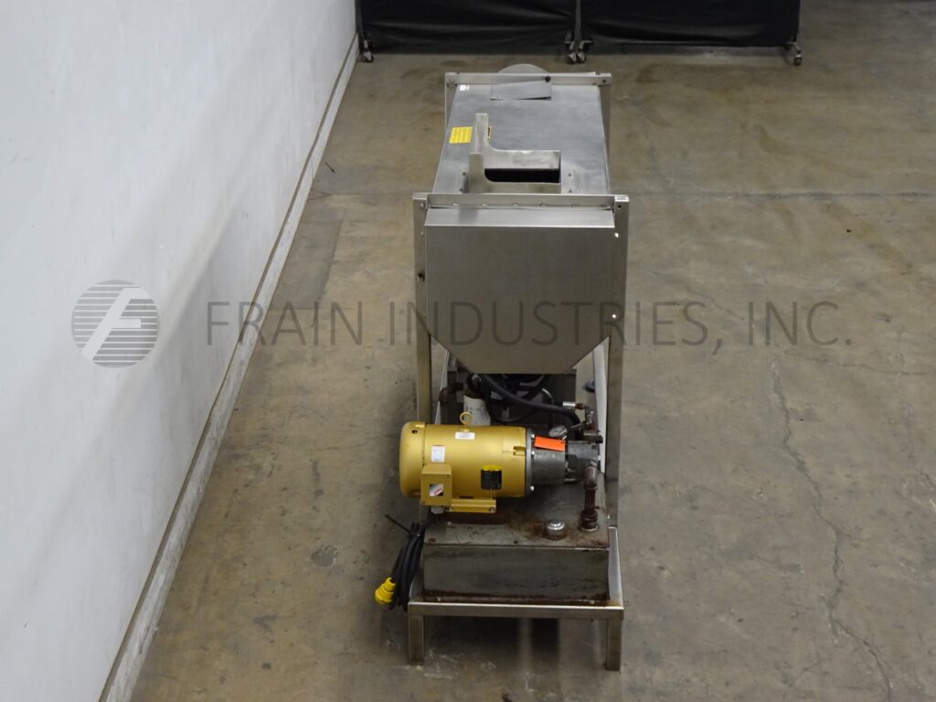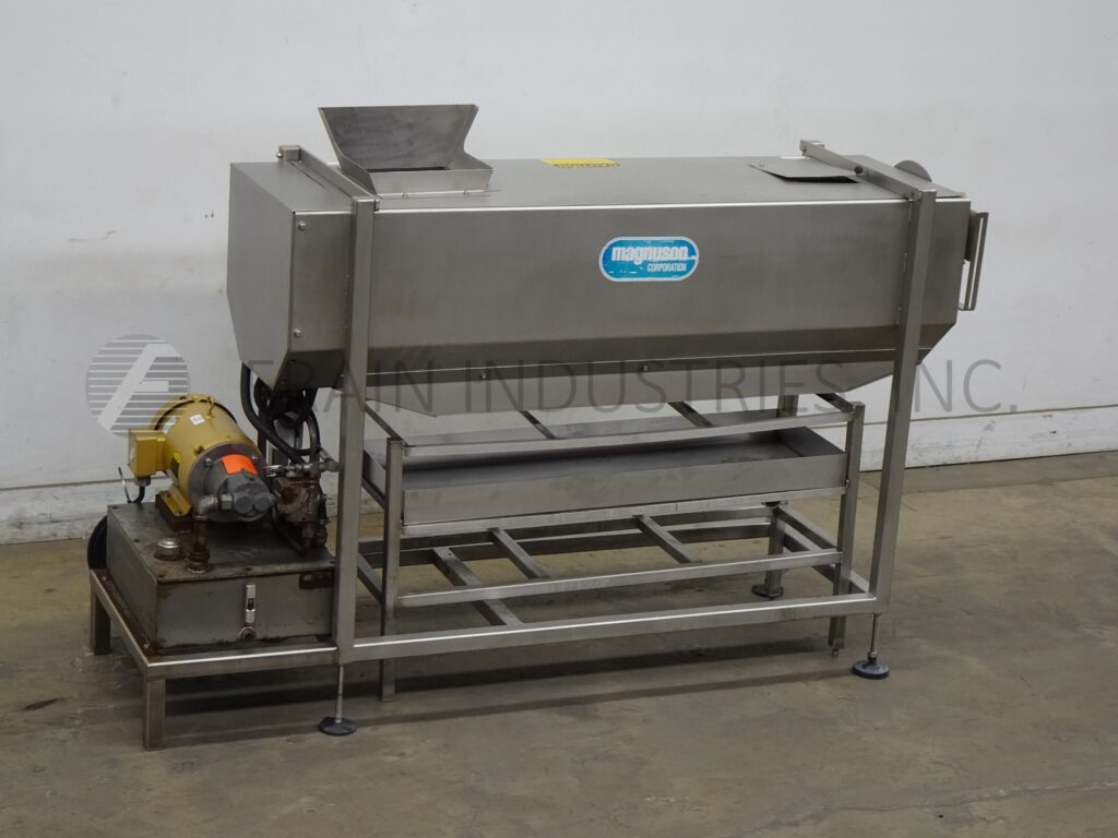 Magnuson, model WSP2000 3750001.0107, heavy duty, 304 stainless steel, roller style peeler and scrubber with pounds of product per hour – depending on materials, application and machine configuration. Equipped with a 12" x 12" charge, (4) 72" long abbrasive rollers powered by a 7½ hp hydraulic pack and a 44" to 48" discharge height. Mounted on (4) leg base frame with casters.