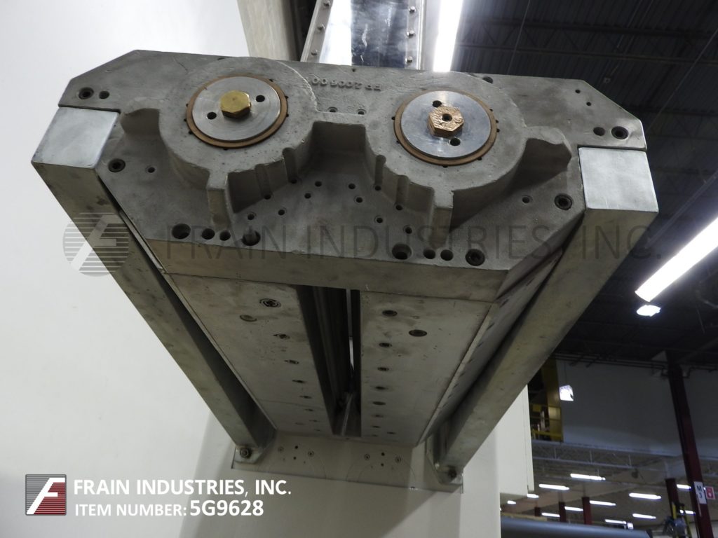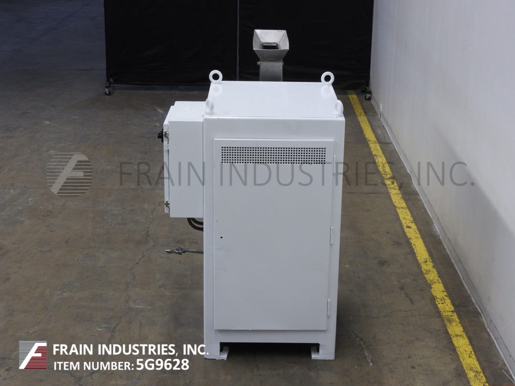 Buhler Maig Model M-MN-400, inline, single screw extruder with productions rates per hour – depending on materials and application. Equipped with product portioner and has product feed hopper with dual 36" long x 2" OD screws feeding 58" long x 4-1/4" OD single screw extruder with 36" long x 4-1/2" OD single barrel and 8-1/2" OD / 4-1/2" ID flanged end product discharge port with (6) 3/4" bolt holes set on 6" centers and 36" floor clearence. Buhler Maig Micro dosing feeder for consitent volumetric proportioning of micro-ingredients such as vitamins, ascorbic acid, dry gluten, egg powder as well as flavoring agents and colorants, thats feeding into the dual screw portioner section that is feeding the single screw extruder. Remote control panel has A/B CPU and stand alone controller with manual, auto, auto clean, standard and nominal run, mixer kneader and mixer kneader up / down, press screw fill water pipe, dosers with on / off switch e-stop and e-stop reset controls and individual temperature controller and a Mokon water heater. All mounted on individual frames.