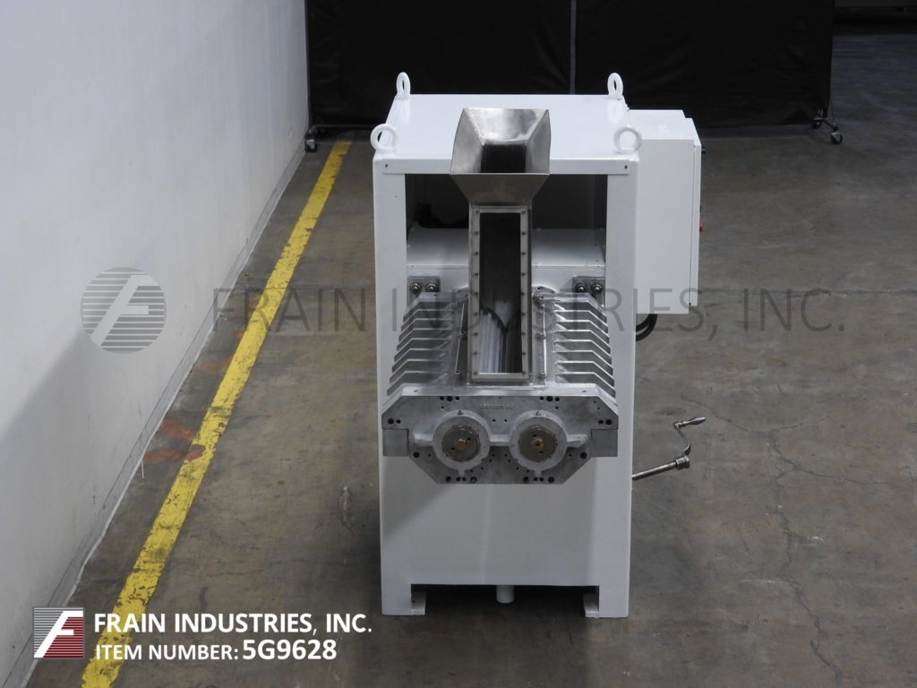 Hosokawa / Bepex / Hutt, Model FP 200 AA, automatic, rotary bar roller press with pounds of product per hour – depending on materials, application and machine configuration. Equipped with a 30" long x 5" wide x 19" deep jacketed product feed hopper and (2) 200mm diameter x 800mm long jacketed rollers. Control panel with push button start / stop controls. Mounted on (4) leg base frame.