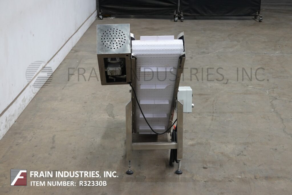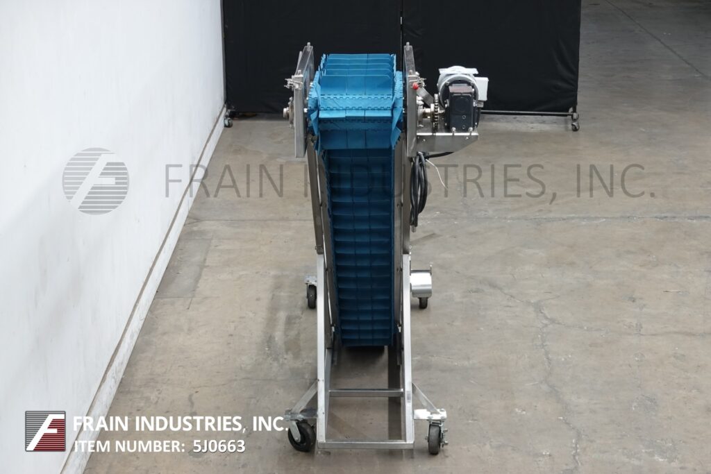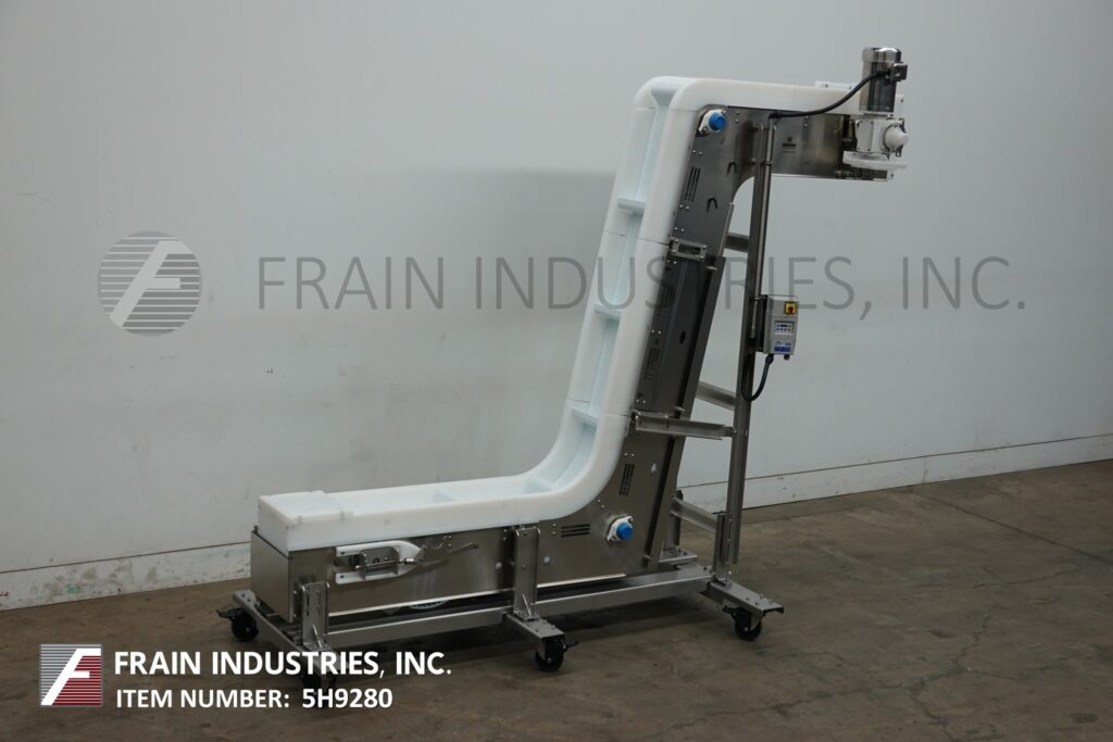 GWI, stainless steel, z type incline cleated belt feeder with number of product per hour – depending on materials, application and machine configuration. Equipped with 18" wide x 110" long food grade conveyor belt with 3" high cleats set on 5¾" centers powered by a top mounted drive. 30" bottom horizontal run with 24" infeed height, 60" incline, 20" top horizontal run with 77" discharge height to a 18" wide discharge chute with a 61" discharge height. Mounted on tubular stainless steel frame.