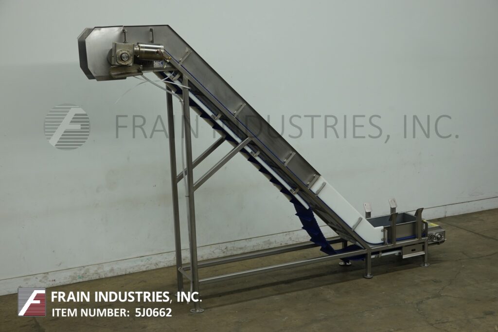 Inclined cleated conveyor, stainless steel. Equipped with a 20" infeed height, 20" wide blue conveyor belt with 2" cleats set on 8" centers. Conveyor has a 48" long bottom horizontal run, 120" long incline, 20" long top horizontal run and a 103" discharge height. Powered by a ½ hp motor drive with variable speed control and mounted on a (4) leg stainless steel base frame.