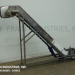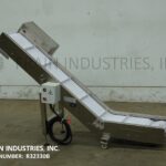 Powell Systems, Model PSI-BI10, stainless steel inclined cleated conveyor with amount of product per hour – depending on materials and application. Equipped with 9¾" wide x 69" long belt with 1¼" high cleats set on 12" centers. 12" long horizontal run has 7½" in feed height. 85" long incline section with 36" discharge height and variable speed controller. Mounted on stainless steel frame with casters.