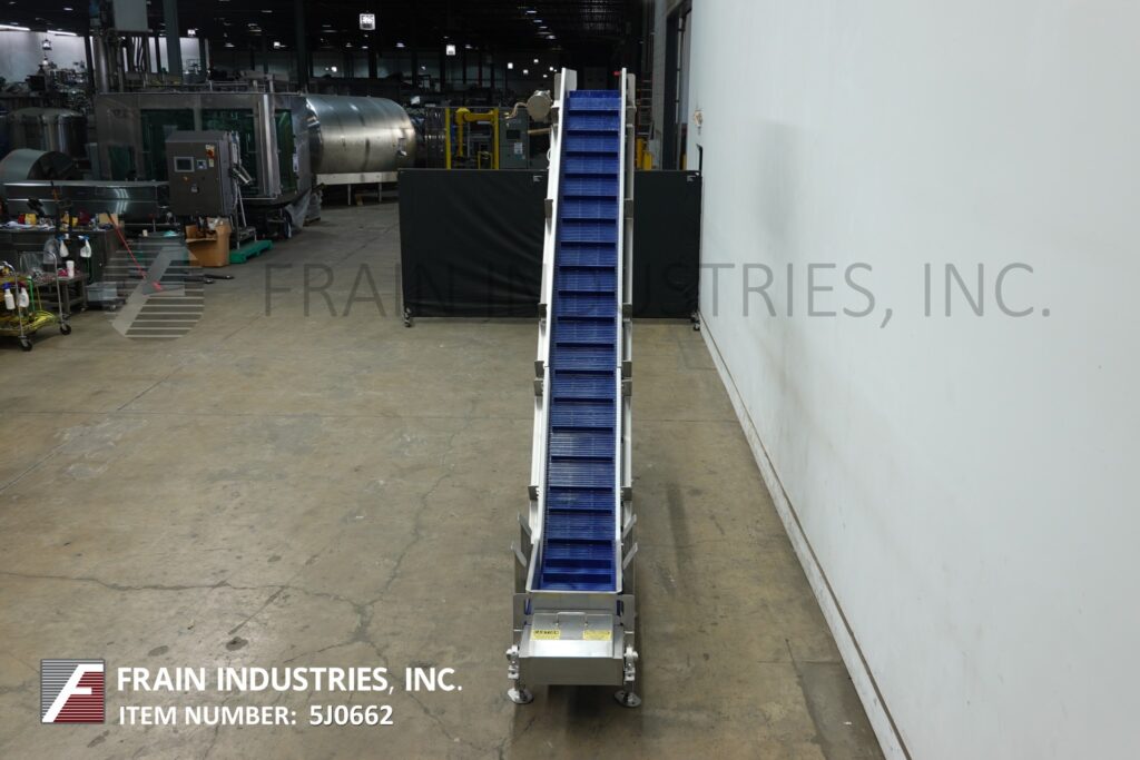 GWI, stainless steel, z type incline cleated belt feeder with number of product per hour – depending on materials, application and machine configuration. Equipped with 18" wide x 366" long food grade conveyor belt with 3" high cleats set on 5¾" centers powered by a top mounted 2 hp drive. 48" bottom horizontal run with 19½" infeed height, 220" incline, 77" top horizontal run, 26" downward angled run with 200" discharge height. Mounted on tubular stainless steel frame.