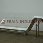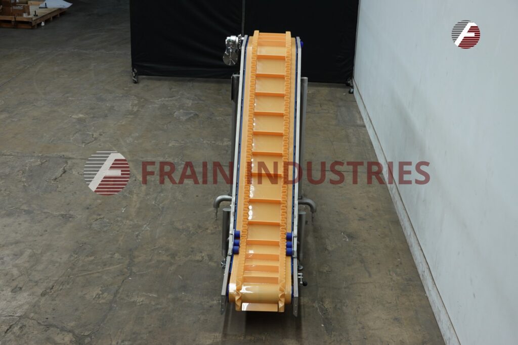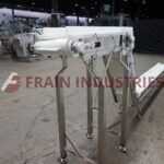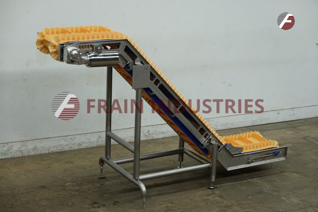 304 stainless steel inclined cleated conveyor with amount of product per hour – depending on materials and application. Equipped with 24" wide x 74" long food grade belt with 1½" high cleats set on 4" centers, 72" incline length, 19½" wide x 7" deep dimpled hopper with a 23" infeed height, 74" long x 2" high flip up guide rails, 71½" long x 24½" wide x 1¼" deep under conveyor drip tray, 21½" wide dimpled discharge chute with 32¼" ground clearance. Powered by a top mounted ½ HP drive. Mounted on stainless steel frame with castors.