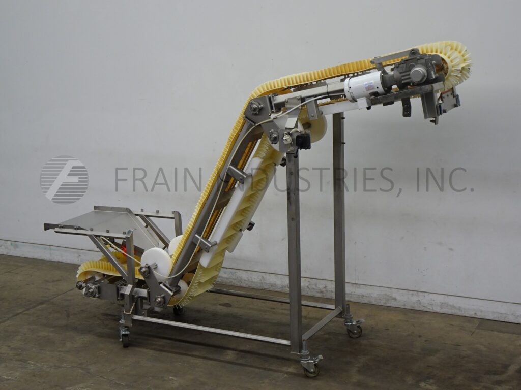 Ohlson, Model VFFX-35, stainless steel inclined cleated conveyor with amount of product per hour – depending on materials and application. Equipped with 10" wide x 69" long belt with 1¼" high cleats set on 9" centers. 21" long horizontal run has 7" in feed height. 48" long incline section with 37" discharge height and variable speed controller. Mounted on stainless steel frame with casters.