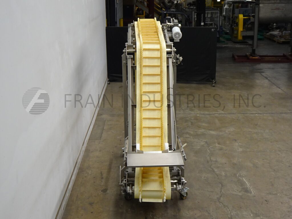 HMI, stainless steel, inclined cleated conveyor. Equipped with 15" infeed height, 16" wide conveyor belt with 2" high cleats set on 7½" centers. Conveyor has 36" long bottom horizontal run, 136" long incline, 16" long top horizontal run with 105" discharge height. Powered by 1 Hp motor drive. Mounted on stainless steel multi-leg frame with leveling legs.