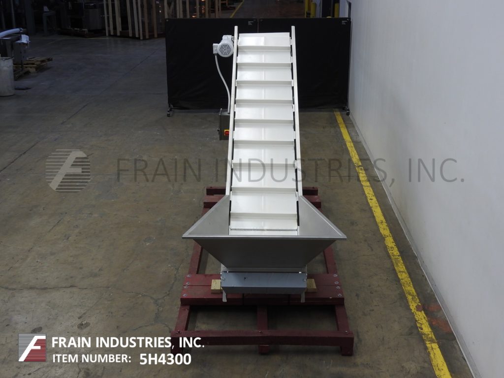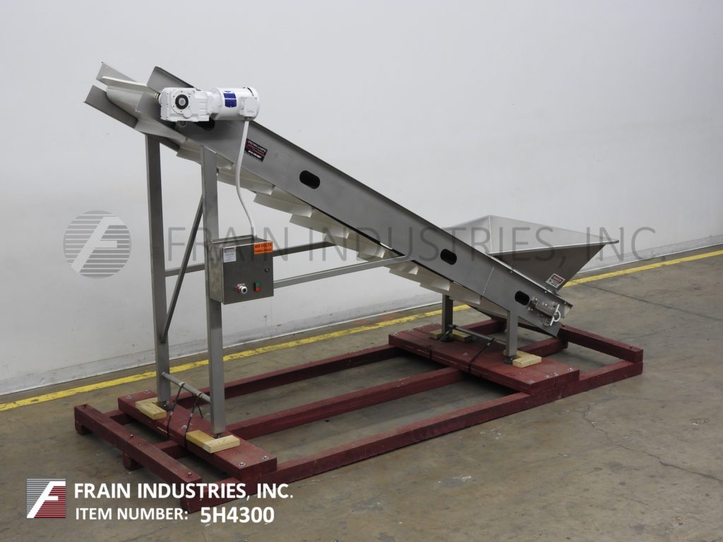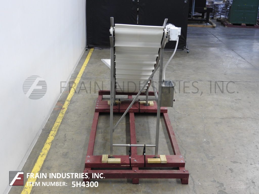 Inclined cleated conveyor, stainless steel. Equipped with 21" infeed height, 18" wide conveyor belt with 3" high x 18" wide cleats set on 8" centers. Conveyor has 53" long bottom horizontal run, 48" long incline, 29" long top horizontal run and a 51" discharge height. Powered by a top mounted ¾ hp motor drive and mounted on a (4) leg stainless steel base frame with casters.