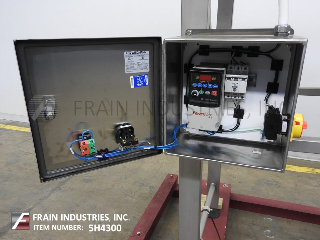 MRM Elgin, stainless steel incline cleated belt feeder with amount of product per hour – depending on materials an application. Equipped with 30½" wide x 36" long x 22" deep (14 ft³) stainless steel product hopper, 13" wide belt conveyor with 3/16" high cleats set on 3-3/16" centers, 77" discharge height with 2¼" wide chute and 77" ground clearance. Powered by .89 hp motor drive. Mounted on stainless steel base frame.