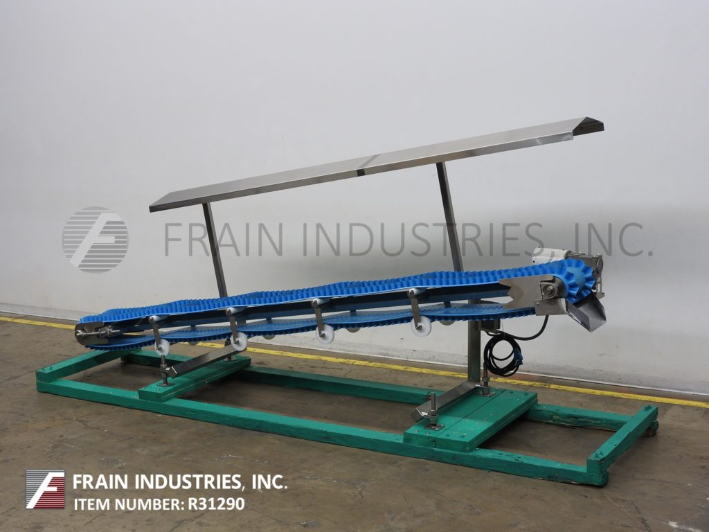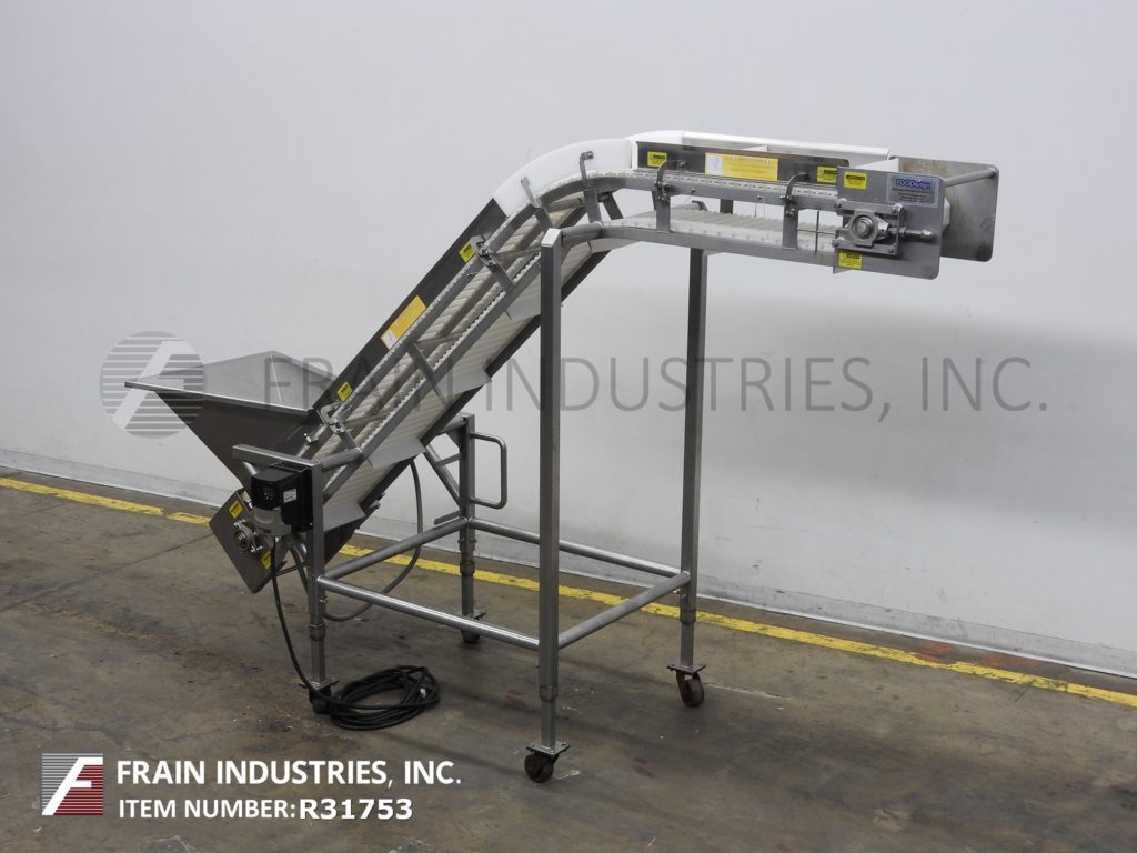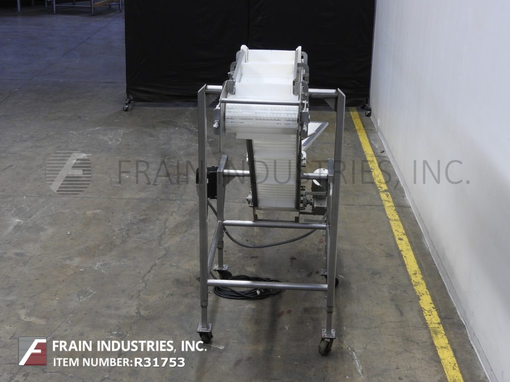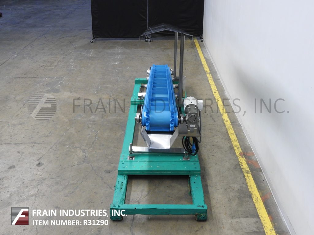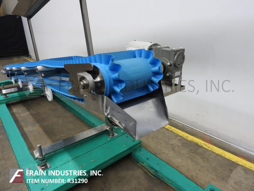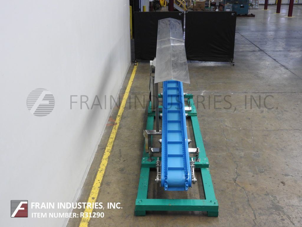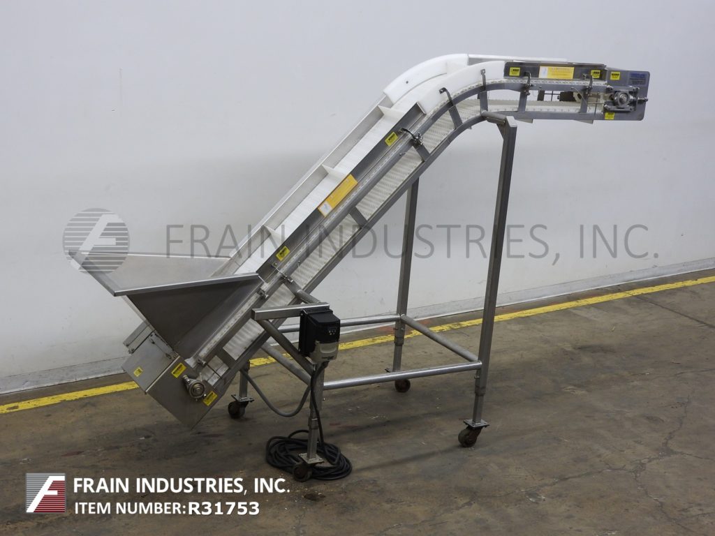 HiMEC, stainless steel, inclined cleated conveyor with pounds of product per hour – depending on materials and application. Equipped with 15" to 27" infeed height, 9" wide food grade conveyor belt with 2" high cleats set on 12½" centers. Conveyor has 176" long incline with 43" to 55" discharge height. Powered by ½ Hp motor drive. Mounted on (4) leg stainless steel frame with casters.