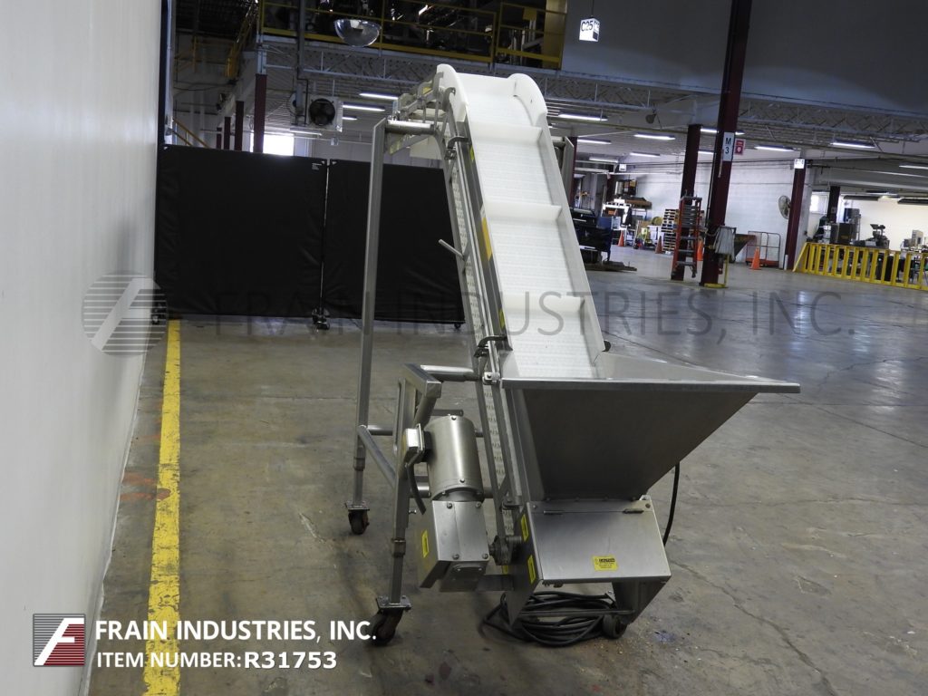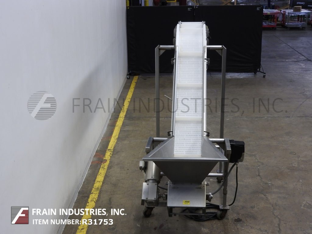 FOODesign, Model VL153189, stainless steel inclined cleated conveyor. Equipped with a 26" wide x 28" long x 18" deep hopper, 12" wide conveyor belt with 3" high cleats set on 18¼" centers. Conveyor has a 88" long incline 44" long top horizontal run and a 80" discharge height. Powered by a 1 hp motor drive with variable speed control and mounted on a (4) leg base frame with casters.
