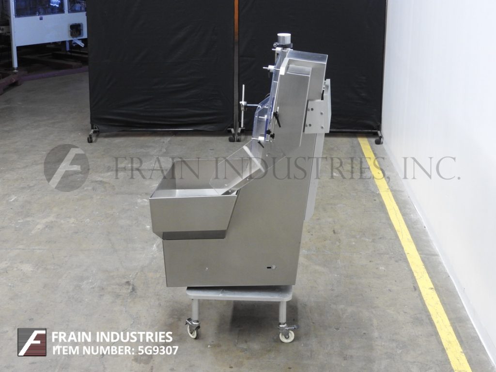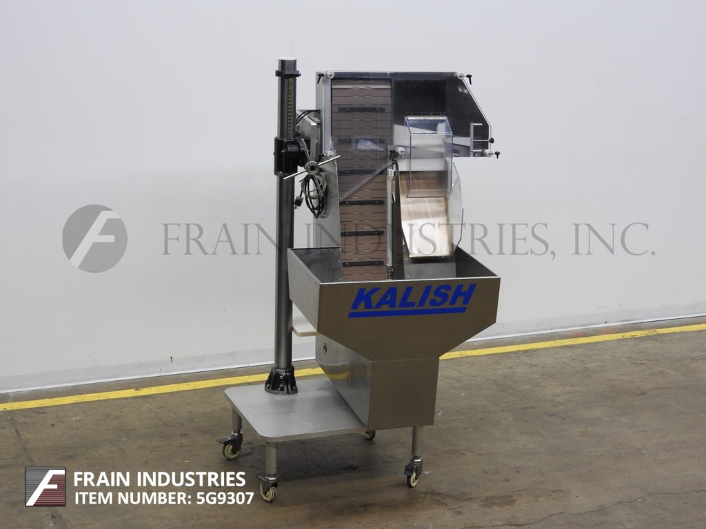 Kalish, Model SDR2, automatic stainless steel water fall style cap elevator / feeder and sorter. Rated from 50 to 300 caps per minute – depending on materials and application. Capable of handling screw, snap or childproof caps (with proper change parts). Equipped with a 10½" wide x 55" long cleated cap conveyor belt with ¼" high cleats on 6" centers, 21" long x 33" wide x 16" deep (approx 5 ft³) stainless steel bulk product hopper, 16" long adjustable cap size discharge chute. Elevator on height adjustable stand with a 61" to 72" discharge range. Mounted on a stainless steel base frame with casters.