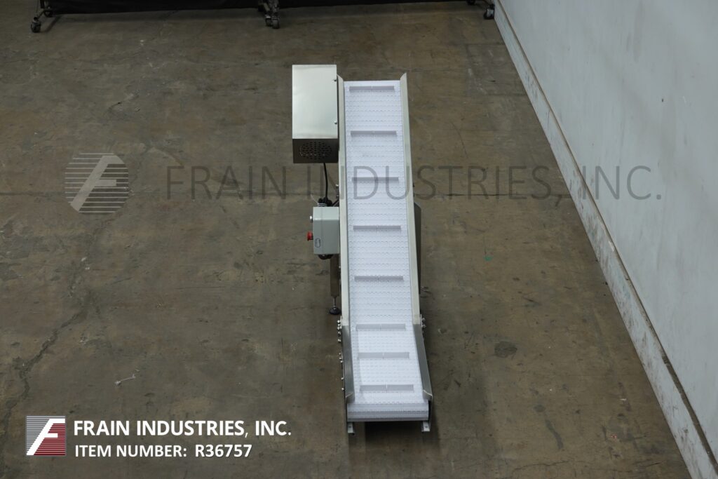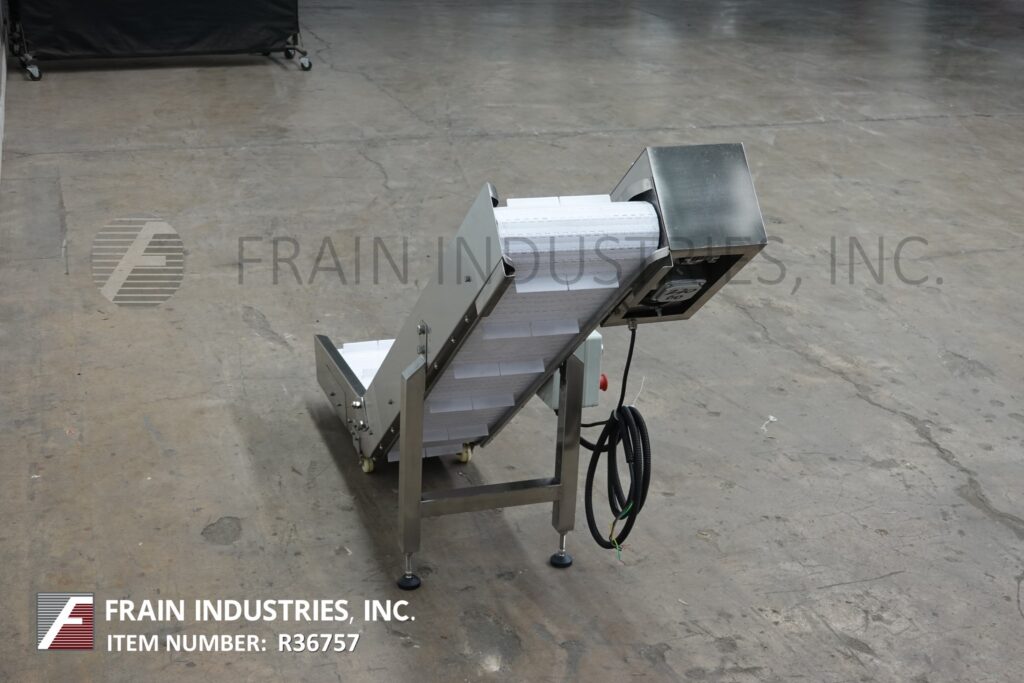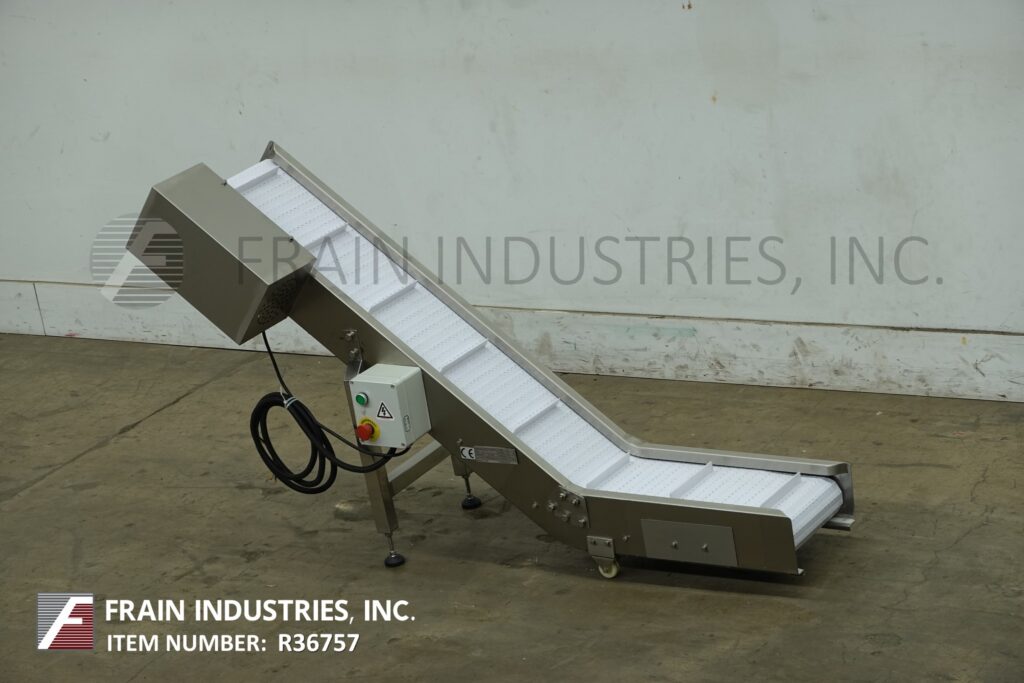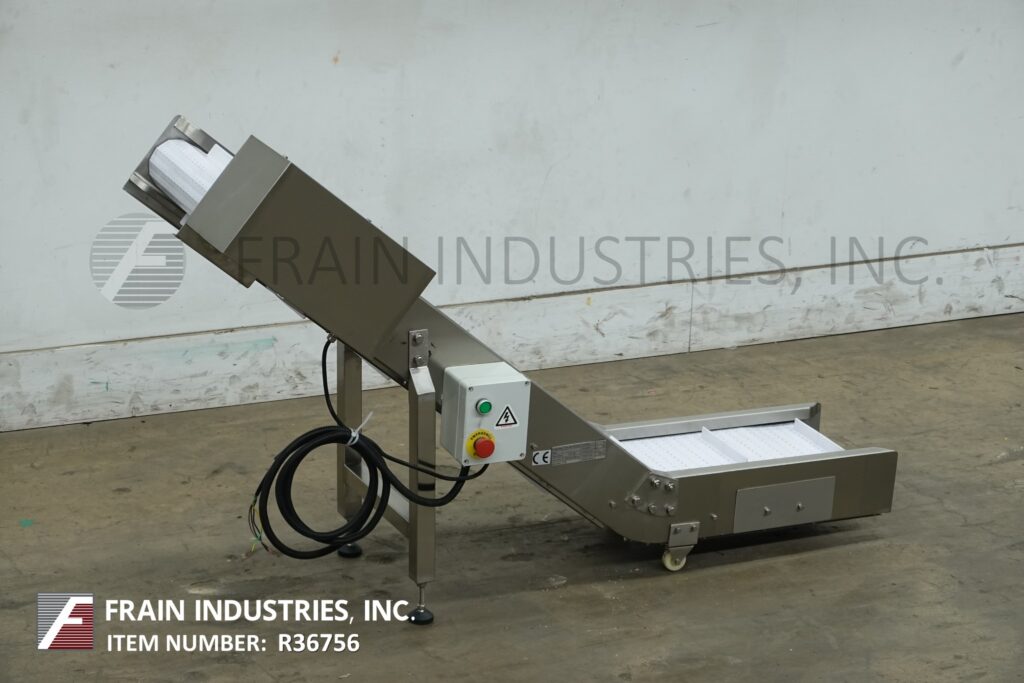 Nercon, Z-Style, stainless steel, inclined cleated conveyor with number of product per hour – depending on materials and application. Equipped with 10" wide white neopreme belt and side guards with 4" high cleats set on 20" centers. 45" long horizontal floor run has 30" in feed height. 76" long incline section and 36" long top horizontal section with 98" discharge height and top mounted motor drive with variable speed controller. Mounted on heavy duty stainless steel frame with caster.
