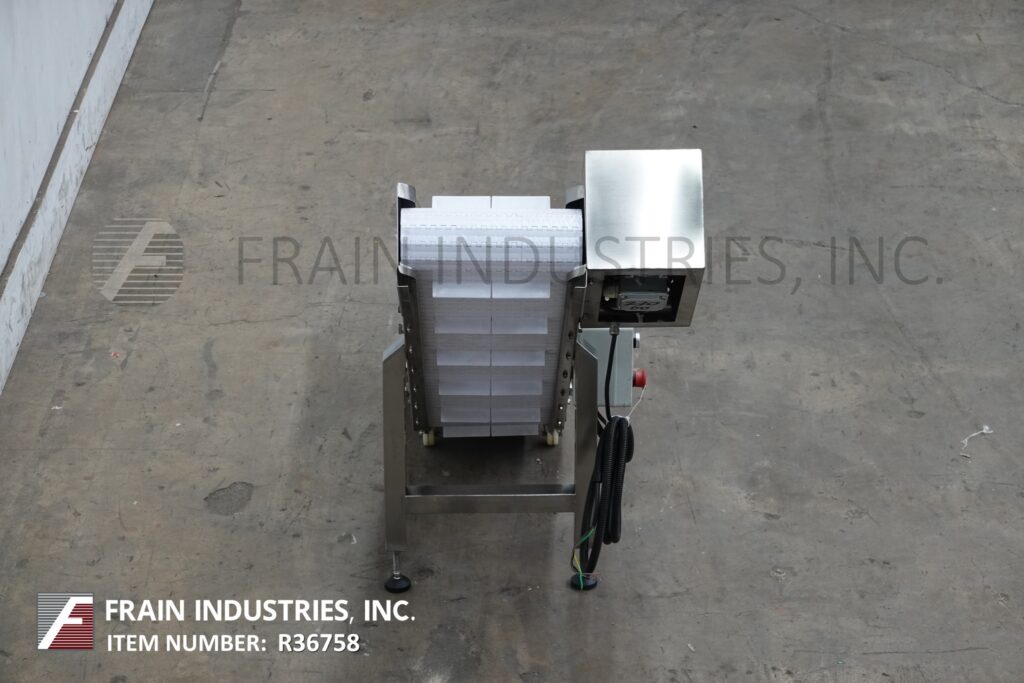 Fowler, automatic stainless steel water fall style cap elevator / feeder and sorter. Rated from 50 to 300 caps per minute – depending on materials and application. Capable of handling screw, snap or childproof caps (with proper change parts). Equipped with a 22" wide cleated cap conveyor belt with 1¼" high cleats on 4½" centers, lexan cover, 12" long discharge chute with 180" discharge height. Control panel with push button start / stop and AB PanelView touch screen HMI.