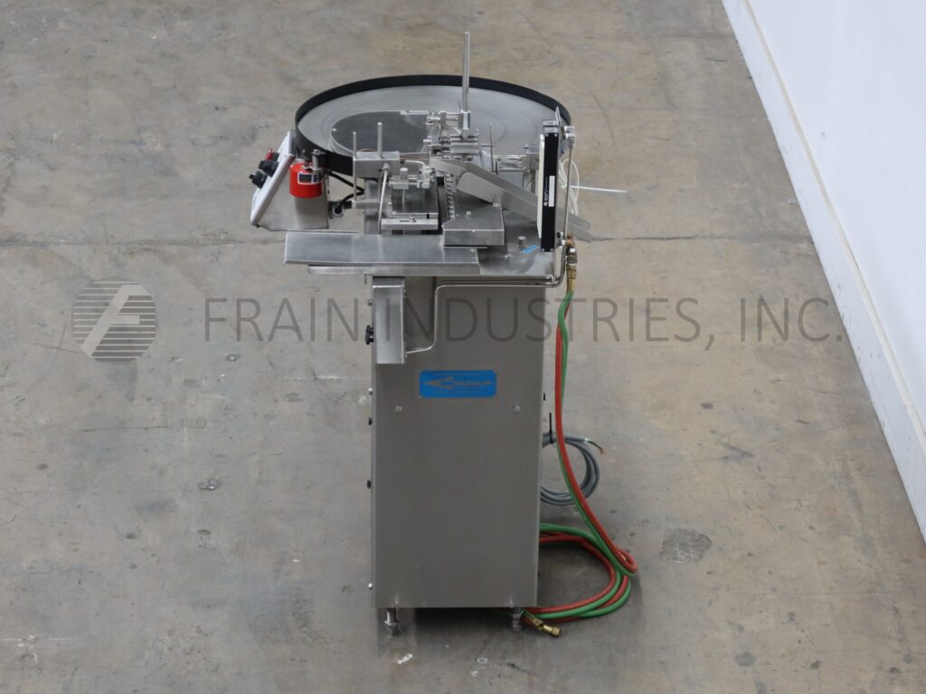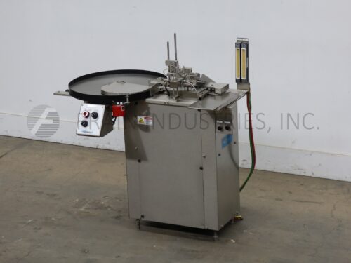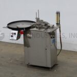 Cozzoli Model FPS2, Automatic, intermittent motion, unscrambler, flush, fill, flush and flame sealer rated up to 120 containers per minute – depending on materials, application and machine configuration. Stainless steel contact parts. Fill range: 1cc to 30cc with accuracies + / – 0.5%. Container size range: 3/8" to 1" in Diameter; up to 5-5/16" in Height and capable of handling ampules, glass tubes, onion skin and vials (change parts required for different size and fill ranges). Equipped with 24" OD disc unscrambling table with 14" long container roller conveyor, container indexing, with no container / no fill and can do 2 containers at a time, flush, fill, flush and flame seal with dual picker arms and reject chute with accumulation table. Mounted on heavy duty frame with casters.