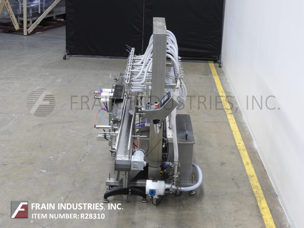 In line, 6-head, pressure overflow filler. Equipped with 4-1/2" wide conveyor with adjustable side rails, six 3/8" OD nozzles mounted on 65" long height adjustable slide bar & product tank with float valve level control. Can handle water-thin foaming or non-foaming to medium viscosity fluids. All stainless steel contact parts. Speeds dependant on materials and application.