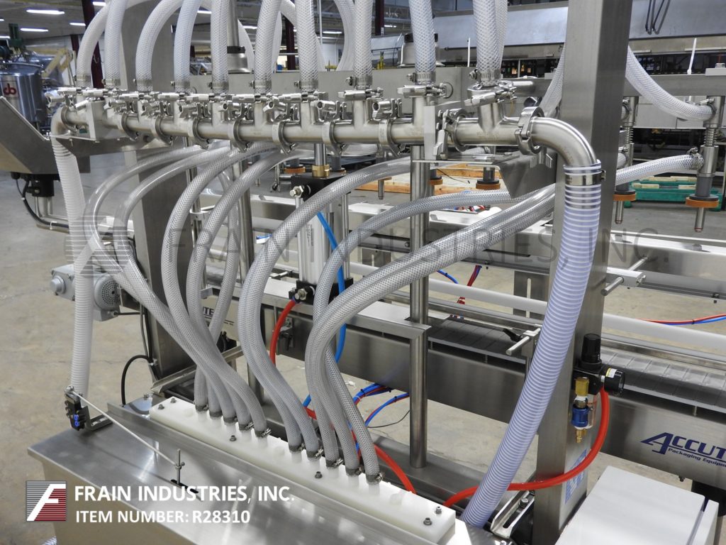 Accutek, Model APOF10, automatic, inline, 10-head, stainless steel, pressure gravity, overflow filler with number of containers per minute – depending on materials and application. Equipped with 120" long x 6" wide Delran container conveyor, pneumatic container indexing, (10) 5/8" OD stainless steel diving nozzles, 72" long drip tray, product overflow tank and 1½ HP centrifuge pump. Touch screen operator interface controller. Mounted on stainless steel frame with casters and leveling legs.