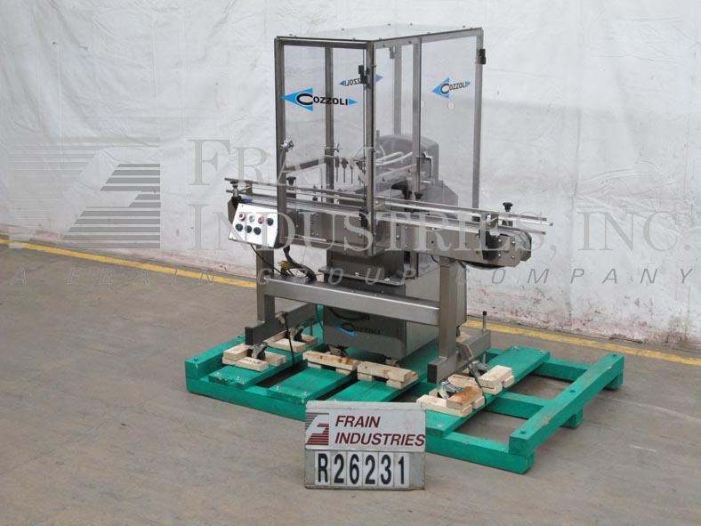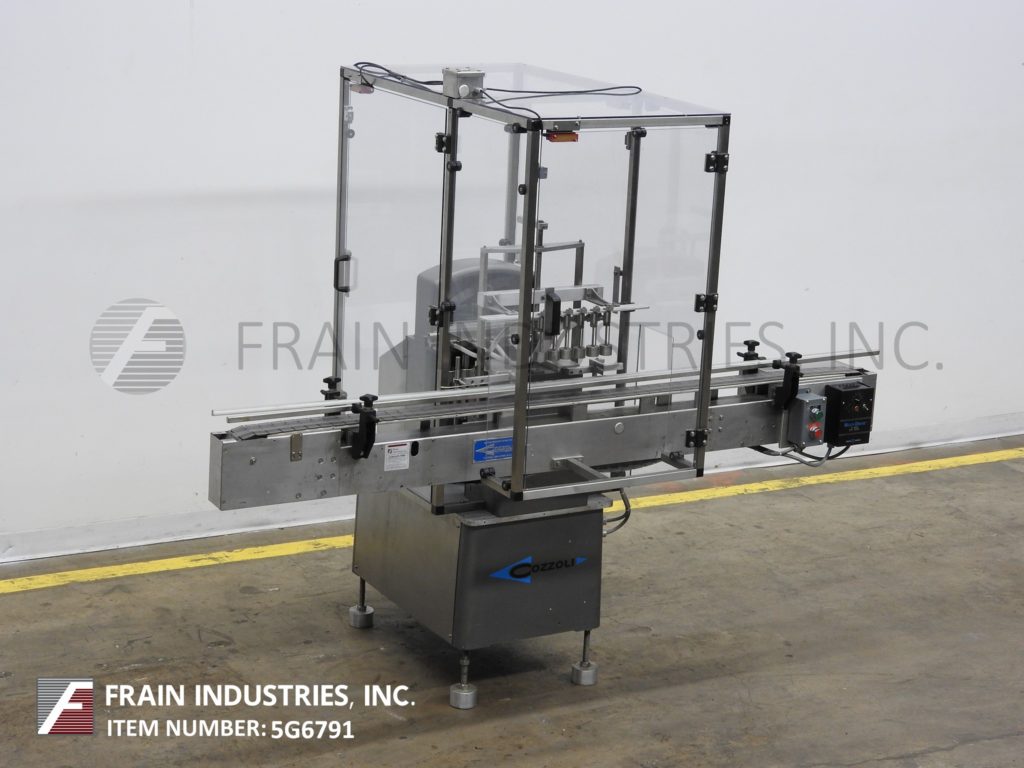 Cozzoli, VR540, 4 Head in-line piston filler. Equipped with 3½" wide by 62" long conveyor, container indexing system, (4) 240cc pistons, diving nozzles and safety guarding. Controls include start/stop, conveyor on/off, conveyor speed, machine speed and auto/manual. Speed dependent on materials, application and machine configuration.