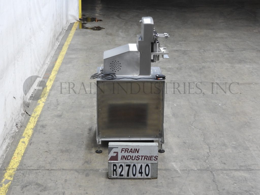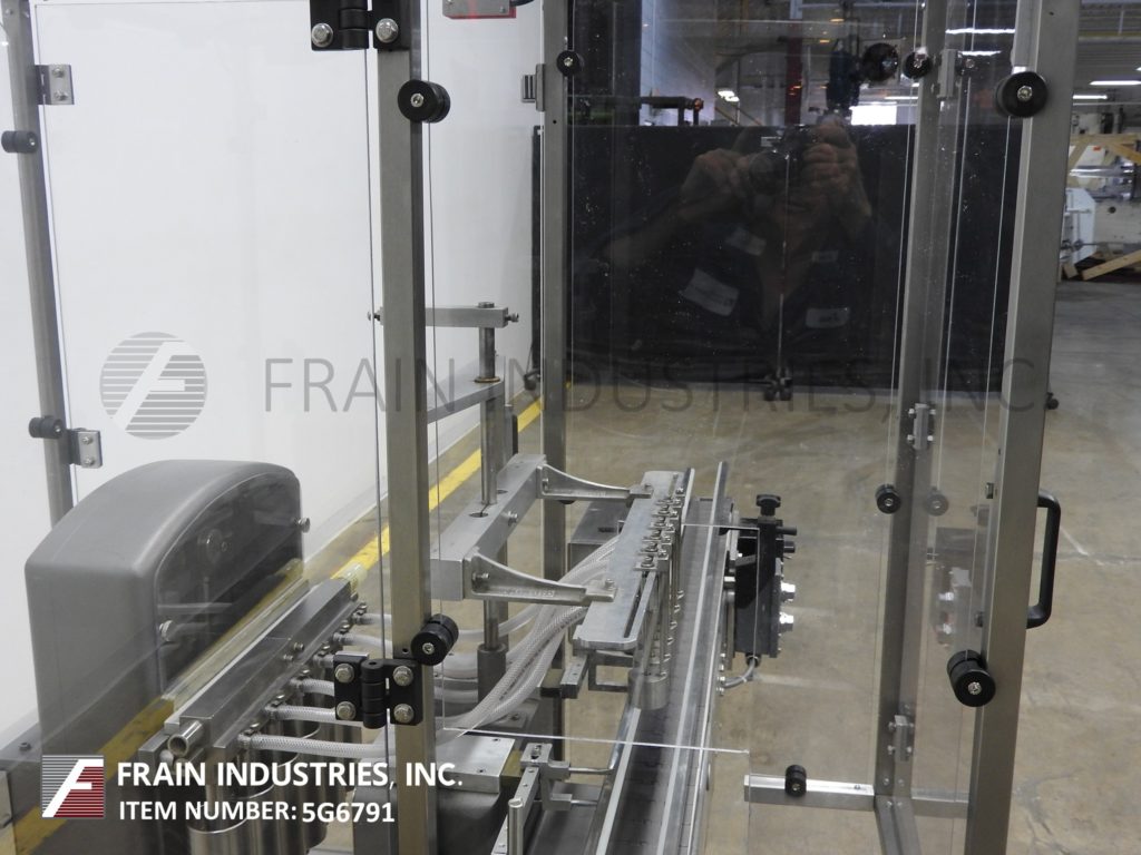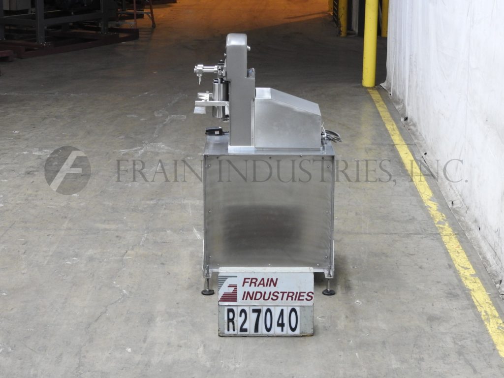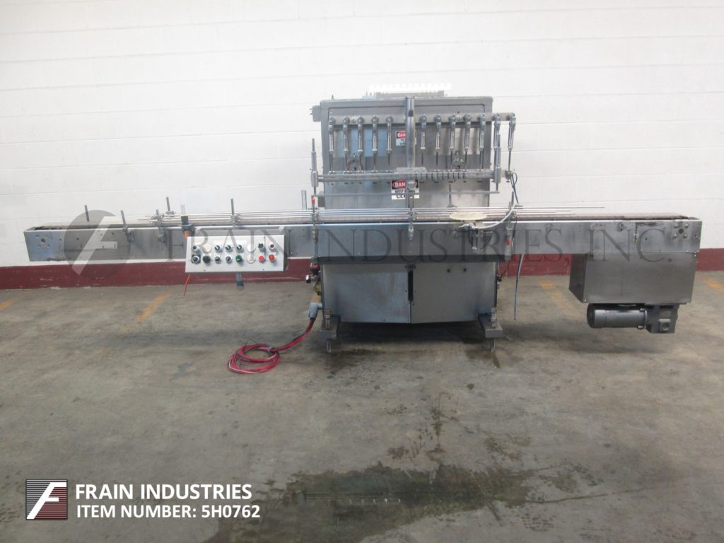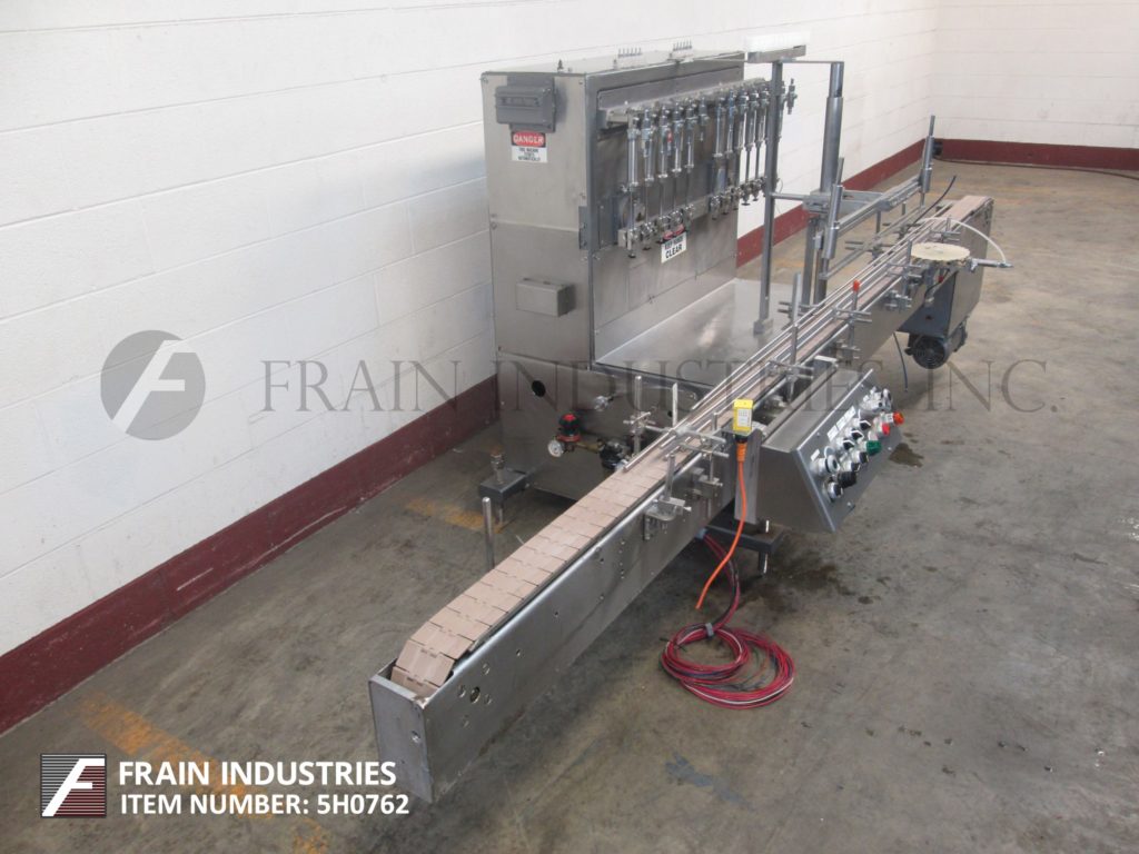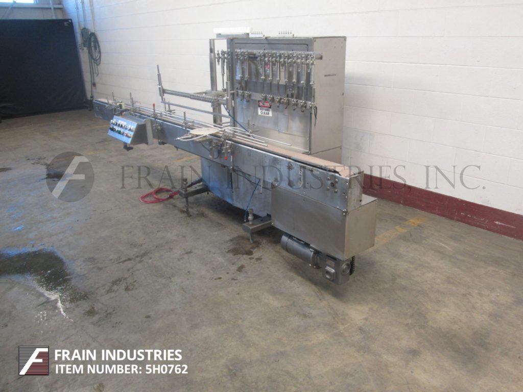 Filamatic Model CVK-500 12 head, high speed in line, automatic piston filler for free flowing, semi viscous and viscous product rated from 24 to 120 containers per minute – depending on materials and application. Fill volume: 0.10cc to 1300cc single stroke (with proper change parts) Currently set with 30cc pistons. Equipped with 136" long x 3-1/4" wide plastic delran conveyor with star wheel indexing, currently set with (12) 30cc pistons, set on 3-1/2" centers. Control panel has filler, conveyor and hesitation speed controls with start, stop and e-stop push buttons. Mounted on stainless steel base frame with height adjustable legs.