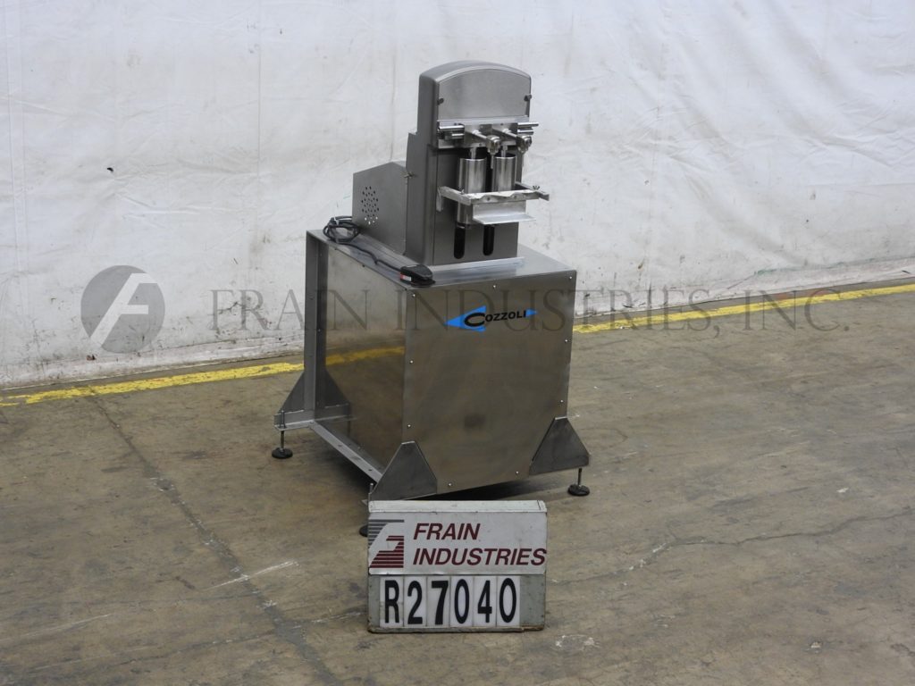 Cozzoli, Model F520, semi automatic dual head table top piston filler. Rated from 2 to 20 containers per minute – depending on material, application, machine configuration and operator dexterity. Equipped with (2) 240ml pistons, (2) nozzles on 4½" centers, stainless steel contact parts, foot pedal operation and 4½" wide x 120" long stainless steel conveyor.