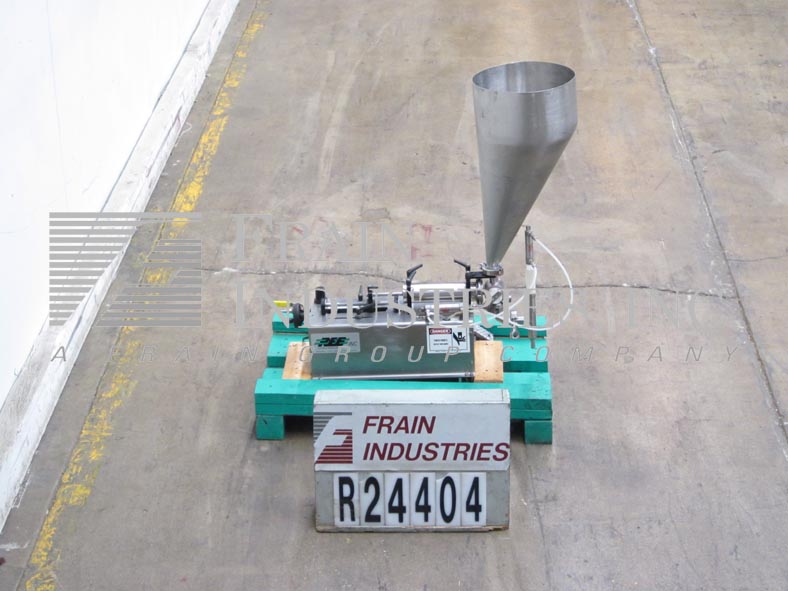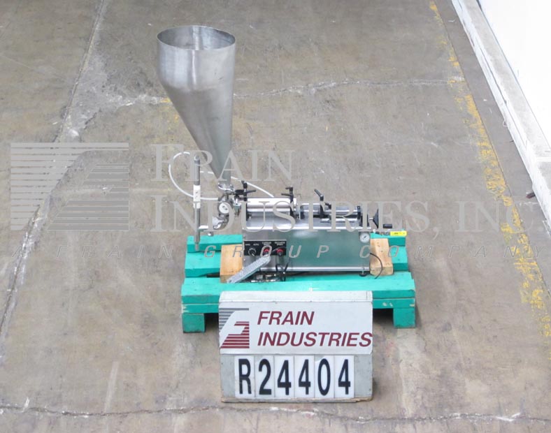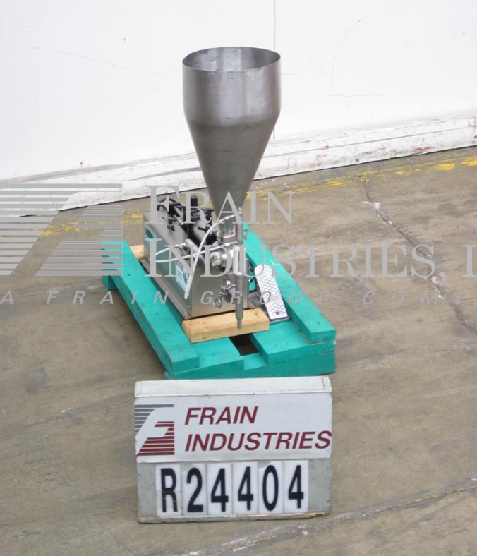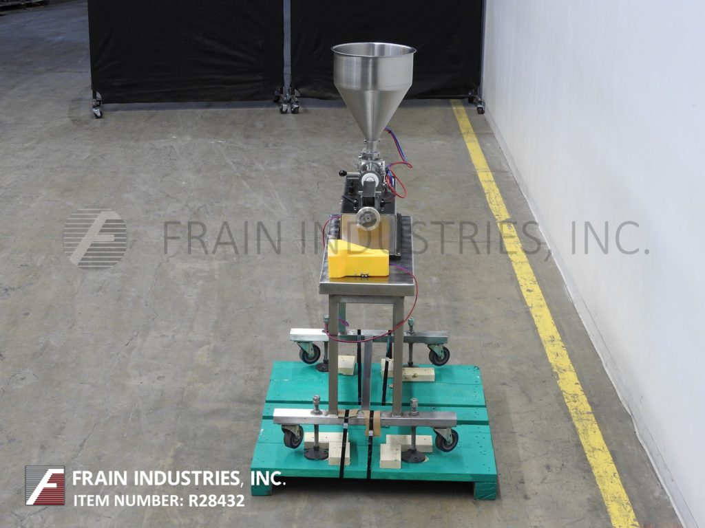 Volumetric Technologies, semi-automatic, 316 stainless steel, single head, table top piston filler. Fill range: .03 oz to 16 oz. with proper change parts. Fill accuracy +/- .25 of 1% volume. Equipped with conical 5 gallon product hopper, 1½" ID piston (0.5 to 9.75 oz range), ½"ID positive cut off nozzle, adjustment with gauge, fill speed adjustment, toggle switch activation and foot pedal control.