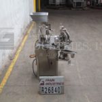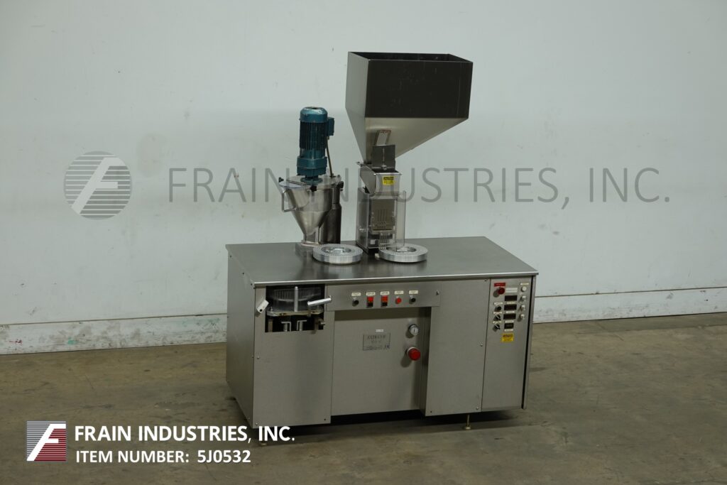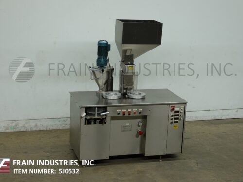 Capsugel Model Ultra 8 ll, Semi automatic, stainless steel powder or pellet capsule filler rated up to 33,000 capsules per hour – depending on materials, application, size capsule being run and operator dexterity. Capable of handling capsule sizes: 000, 00, 0 and 1 thru 5 with proper change parts. Equipped with fill ring holder, empty capsule hopper, slide gate magazine, vacuum rectifier head, with clockwise rotation indexing ring, index brake, product hopper with top mounted agitation, self-contained horizontal hydraulic closing system, oil-less vacuum pump, excess product receptacle and has push button controls. Mounted on stainless steel frame.
