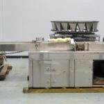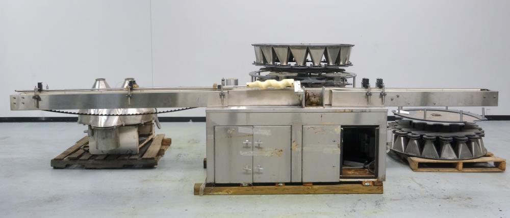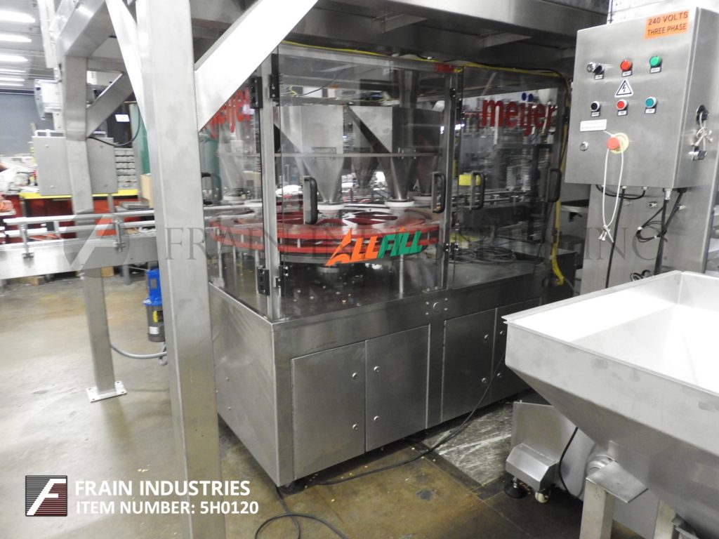 All Fill twin head 8 station, rotary funnel filling system with worm screw infeed and table top chain conveyor.