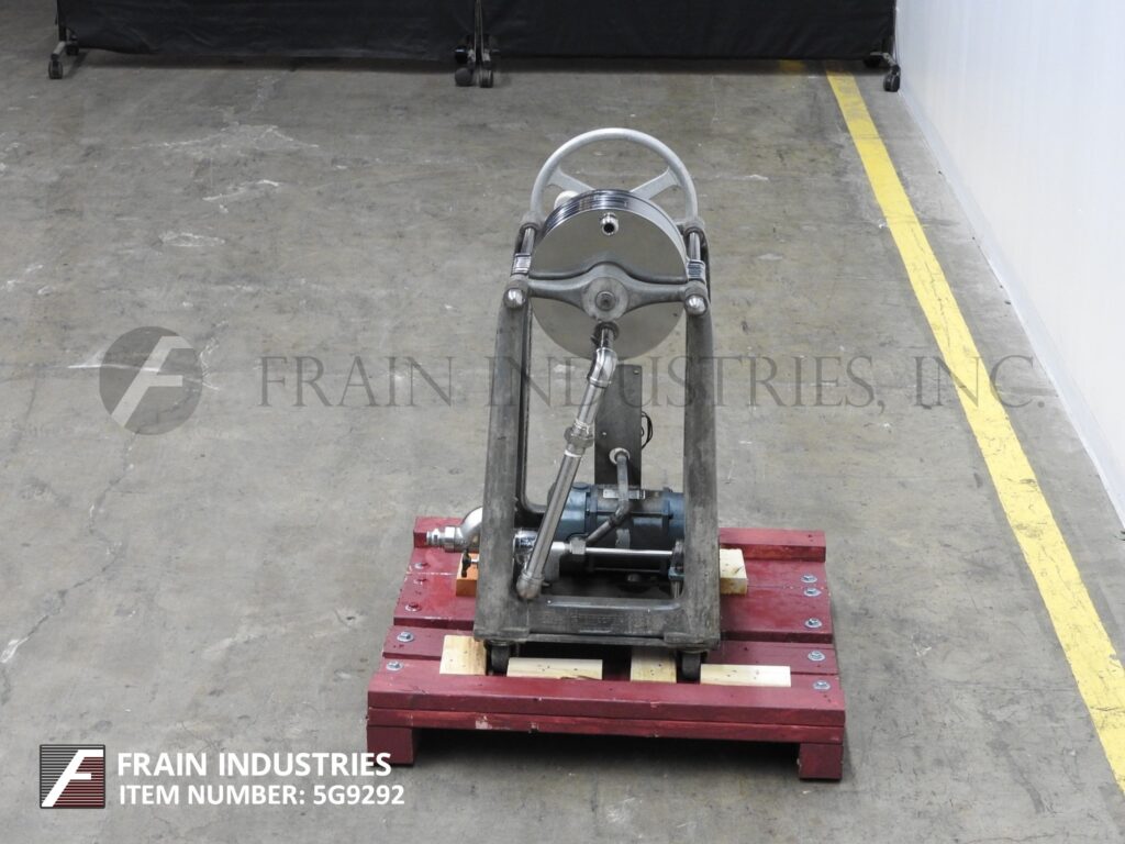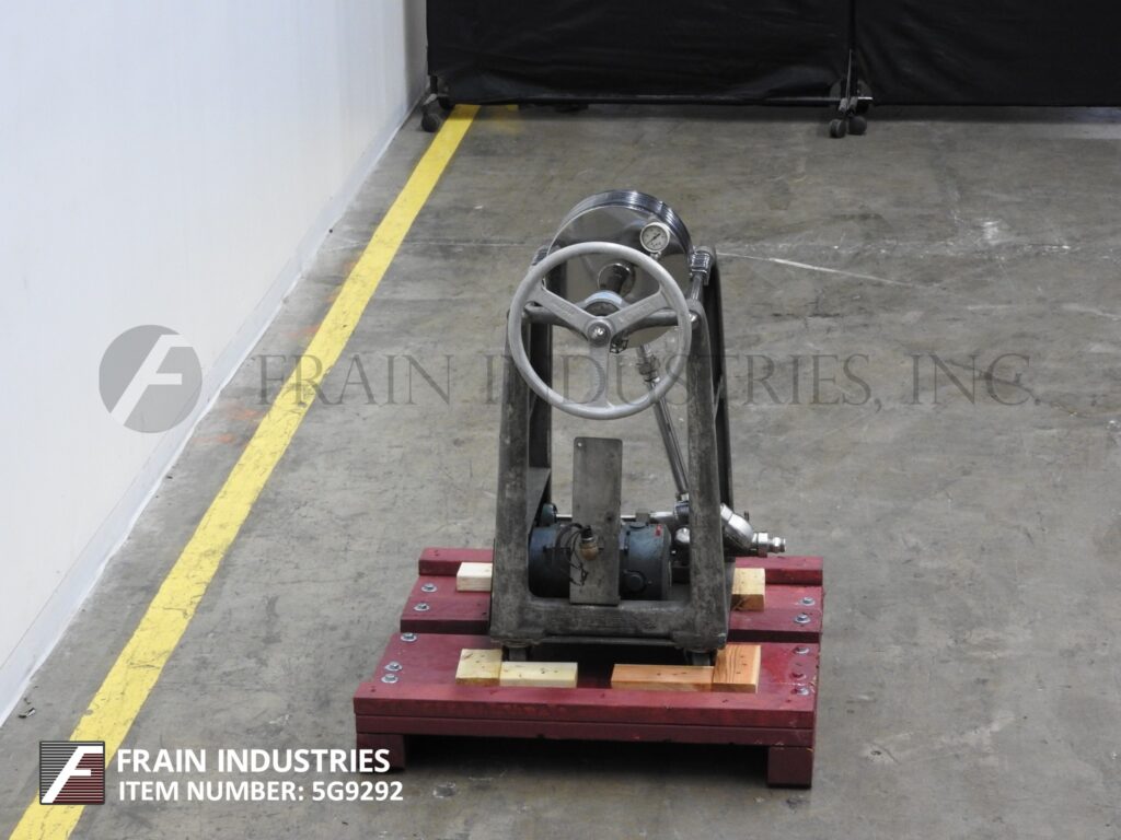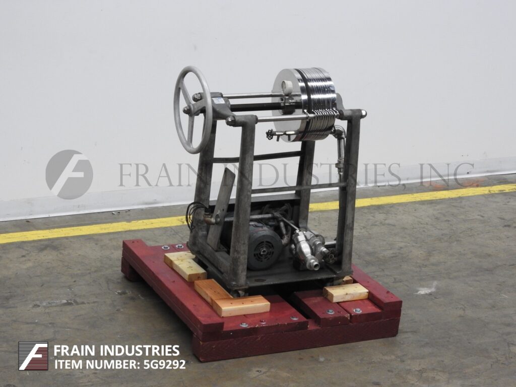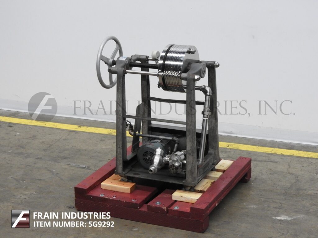 Ertel, Model 2HS, horizontal, 316 stainless steel plate and frame filter press. Volumes of product per hour – depending on materials, application and machine configuration. Equipped with (5) 12" OD stainless steel filter plates with filteration area of 4 ft², (4) (3/8)" thick sludge plates with sludge capacity of 0.1 ft³, ¾ hp positive displacement pump, 1" NPT pump inlet with a check valve, ¼" ID outlet nozzle, hand crank filter closure and pressure guage up to 100 psi. Mounted on (4) leg base frame with casters.