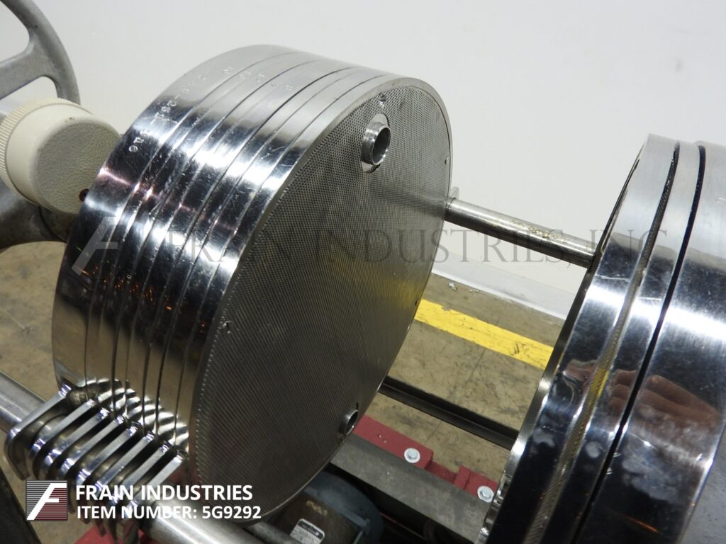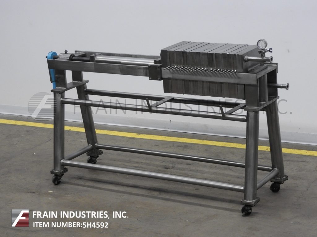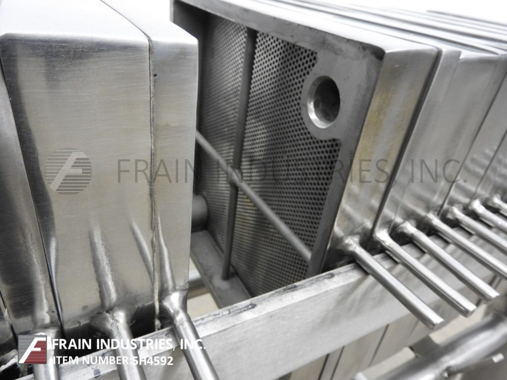 Perrin / Evoqua Water Technologies, horizontal, stainless steel, side bar plate and frame filter press. Volumes of product per hour – depending on materials, application and machine configuration. Equipped with (50) 24" x 24" x 1" square cake plates with cake capacity of 16 ft³ and (51) 24" x 24" filtering plates with a filteration area of 200 ft², (4) 2"OD/1½"ID Tri-clamp inlet / outlets, hand crank filter closure and air over oil hydraulic finishing closure. Mounted on (4) leg base frame.