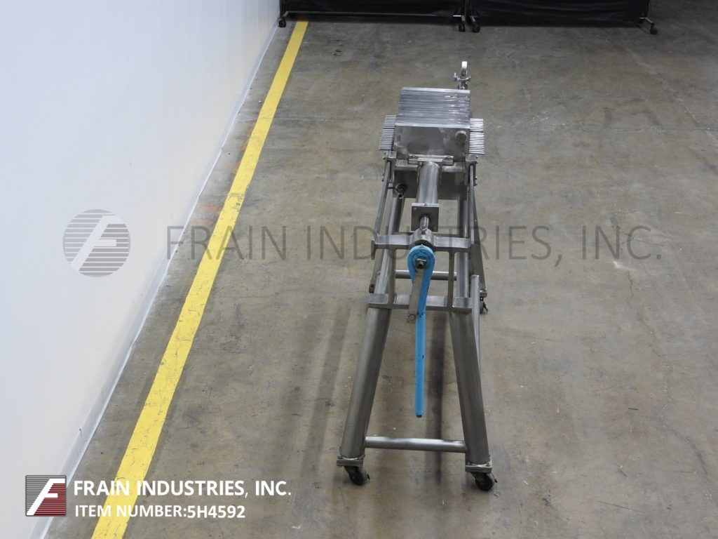 Star, Model 20SS4 113S2 TIC, horizontal, stainless steel, plate and frame filter press. Volumes of product per hour – depending on materials, application and machine configuration. Equipped with (20) 12-7/8" x 12-7/8" square plates with filteration area of 10 ft², 1½" thick sludge plates with a sludge capacity of 1¼ ft³, 2"OD / ¾"ID Tri-clamp inlet, 2"OD / ¾"ID Tri-clamp outlet, hand crank filter closure and pressure guage. Mounted on (4) leg base frame with casters.