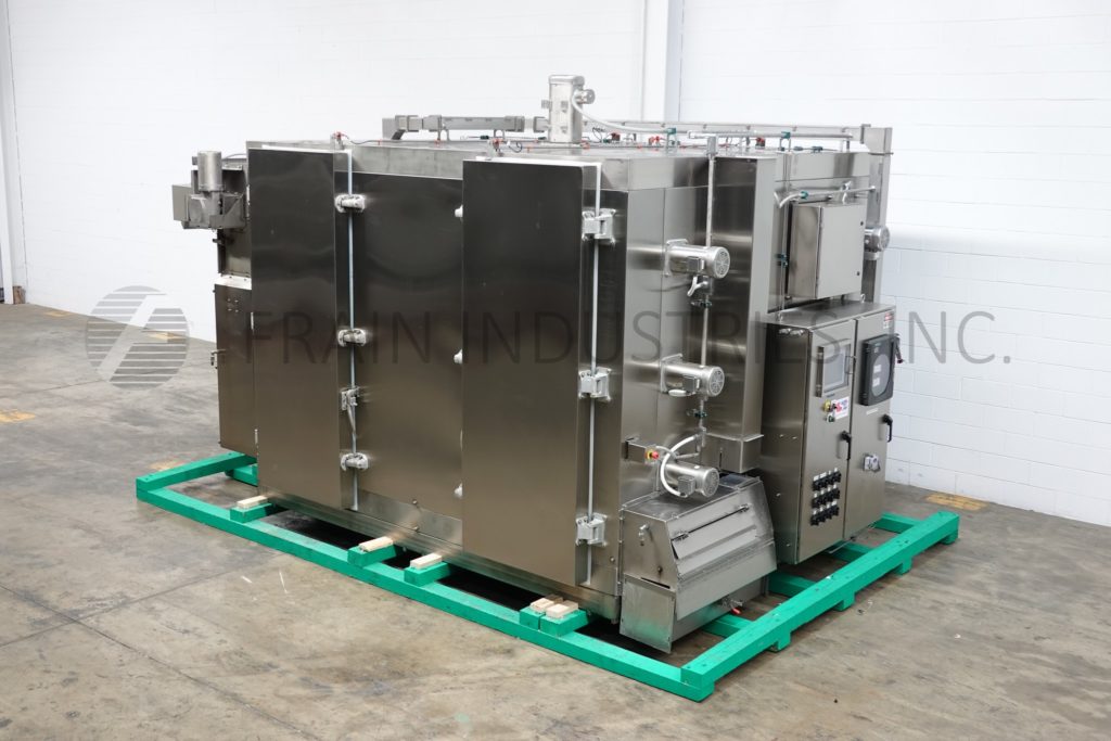 Cryogenic Systems Equipment Inc, Stainless steel CO2 spiral freezer with amount of product per hour – depending on materials and application. Equipped with 27½" wide stainless steel mesh belt has 36" high infeed and 10" high discharge, 14 tiers with 2-7/8" clearance between each tier and the drum is 108" in diameter from outside to outside of belt and has inside box dimensions of 120" long x 120" wide x 92" tall and has (9) fans, 24" and 16" in diameter with (4) access doors 36" wide x 96" tall x 6" thick, can rapidly chill, crust and fully freeze a wide variety of products that moves through the freezer on a continuous spiral conveyor and uses CO2 as freeze medium. Stainless steel control panel has A/B PLC with A/B PanelView Plus and 10" touch screen controls, with Honeywell Truline chart recorder and (7) A/B PowerFlex VFD’s. Mounted on multi-leg stainless steel frame.