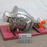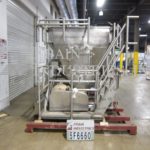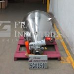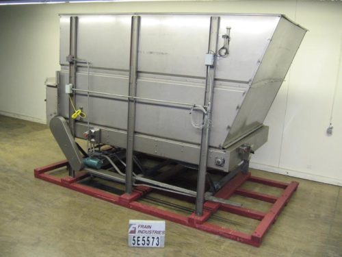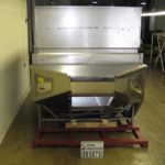 Lakso, Model 73, stainless steel hopper feeder and hoist. Equipped with a 36" long x 36" wide x 25" deep stainless steel hopper with lift up cover and 7" wide x 19" long vibratory feeding conveyor. Hopper is mounted on a hoist for a discharge range of 7½" to 52". Control panel with push button up / down, on / off switch and variable speed dial.