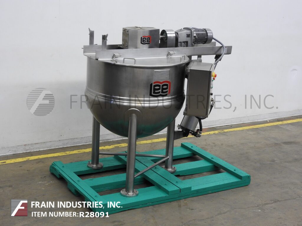 Lee, Model 100 NEM, 100 gallon capacity, 316 stainless steel, double motion (scrape & prop) kettle. Vessel dimensions: 36" diameter x 30" deep with a 14" straight wall. Equipped with lift off covers with safety shut-off, bridge mounted 3 HP scrape and 1 HP prop agitator, flush mounted sensor and 2½" OD / 2" ID Tri-Clamp style bottom discharge with ball valve and 15" ground clearance.