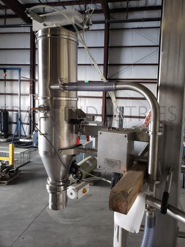 IEDCO complete bulk bag unloading, conveying and column / tank filling system. Rated up to 2500 lbs/hr depending on materials, application and machine configuration. System consists of a bulk bag unloader, rotary valve, scale hopper, vacuum conveyor, dust collector and column / tank filling station. Bulk bag unloader is equipped with a 135" long I-Beam that extends 70" past frame, a Yale 2 ton hoist with pendant controls, bag spout choker / cincher, agitation paddles and bag deflation. Bulk product is fed into the scale hopper through a rotary valve that can be operated in both an automatic and manual mode. Product is received in a 36" diameter x 55" deep vessel with a vacuum feed adapter. The 16.375 ft³ hopper is mounted onto a 1000 lbs capacity load cell. Product is moved from the scale hopper into a G900 vacuum conveyor mounted on a Pneumalift conveyor with push button controls to raise and lower the chamber. The vacuum conveyor has a diverting valve that can be used to remove product from a secondary source with a wand. Vacuum conveyor chamber is equipped with a level sensor that will open a butterfly valve when full to be emptied into a column / tank. System also includes a 41" x 43" filling station with Pneumaseal brakes to hold tank in place. Filling station has air bags to lift tank into place, vibrators for compacting material and load cells for final batch weight. System includes a Nederman filterbox dust collection that is connected to the scale hopper, feed station and is used for the bag deflation process. System mounted around a two tier operator mezzanine with a 43" wide x 154" long lower platform set 39" off the ground and a 60" wide x 88" long upper platform set 63" off the ground. Upper platform has a 44" diameter x 16" deep cut out for columm / tank. Control panel is equiped with a AB controller and touch screen HMI.