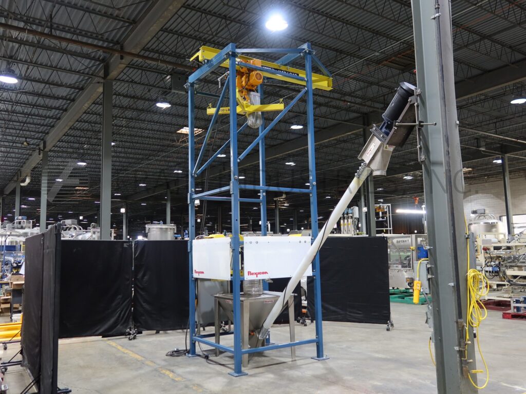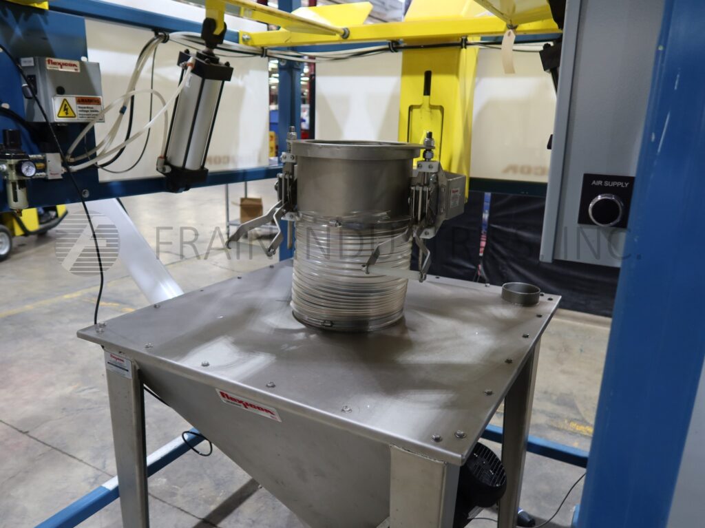 Flexicon, Model BFC-C, Bulk bag, super sack unloading and filtration system rated up to 135 cubic feet of product per hour with number of bulk bags – depending on materials, application and operator dexterity. 304 stainless steel refined finish. Equipped with 108" long cantilevered I-beam extending 43" beyond frame with spider lift bag attachment rated to 3200 lbs. that allows lifting of various size bulk bags and has powered hoist and trolley with bag massagers, and 12" OD tele tube with clamp ring to secure sac chute. Bag-Vac dust collector on the side of the bulk bag discharger with collection and return chute with 50 Sq Ft filtration area through (1) spun bond polyester filter cartidge. Mounted on heavy-duty box tube structural design frame.