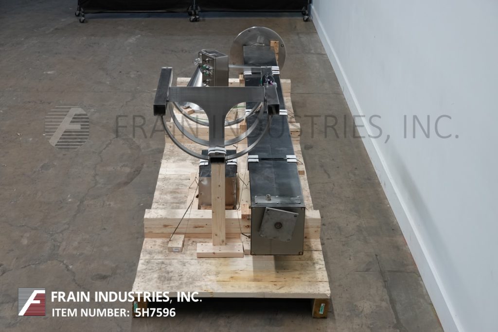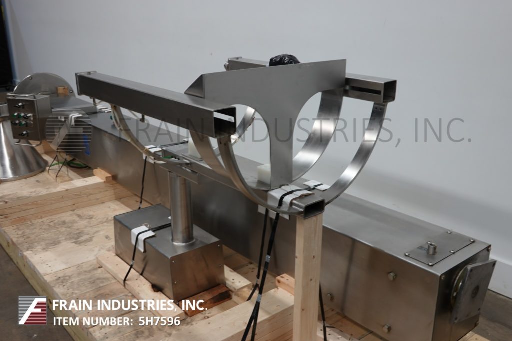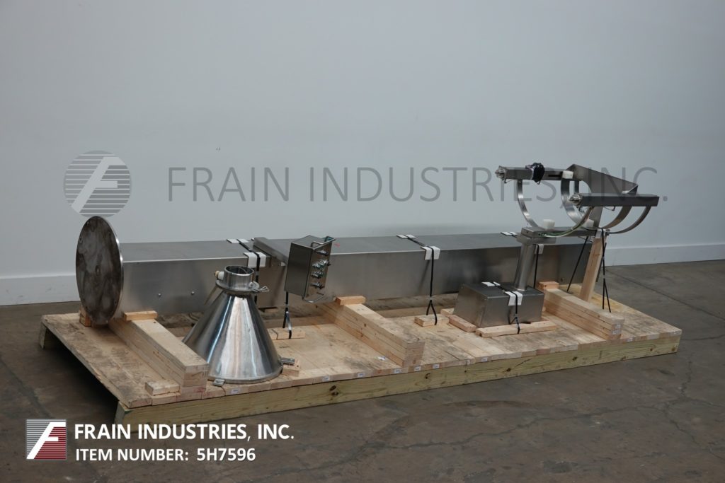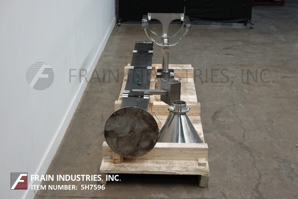 Mac Process Equipment, Stainless steel super sack unloading system rated to 2,000 lbs capacity with number of pounds and bags per hour – depending on materials, application and operator dexterity. All stainless steel box tube design with I-beam and spider lift attachment. Harrington 1 ton (2,000) lb capacity powered hoist and trolley (1) 26" OD x 32" long stainless steel conical product recieving hopper with flow control valve to 26" OD x 21" long conical product metering discharge hopper with bag massager, Schenk Accurate Mid-Mech LIW weight loss metering system has controller and readout with Mechatron feeders and Mac Process CRA10 airlock and rotary valve discharge with 36" floor clearence. Control panel has microprocessor controller, with hoist up / down, flo-lock gate open / close and sure seal, seal / unseal push button controls with massager auto, off, on switch and A/B Powerflex vari speed controller. Mounted on heavy-duty all stainless steel box tube design frame with stainless steel cage style safety guarding and stainless steel access ladder and platform.