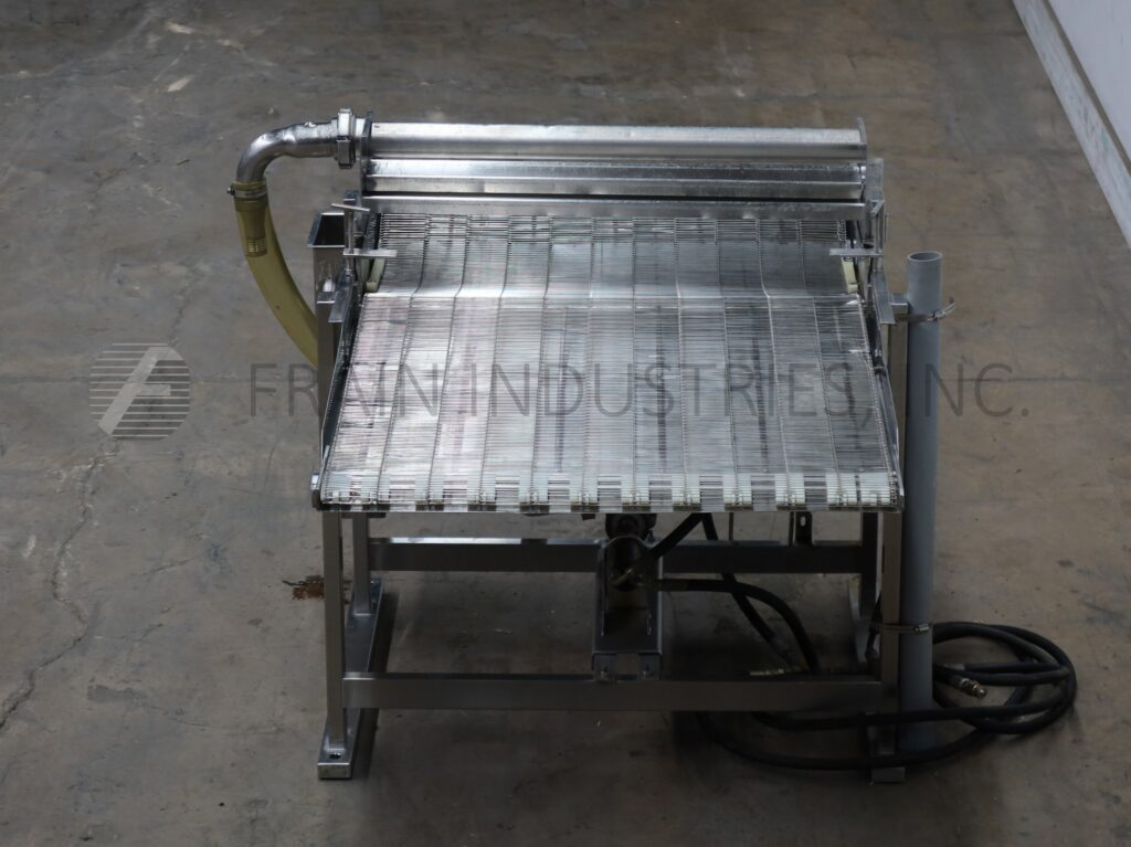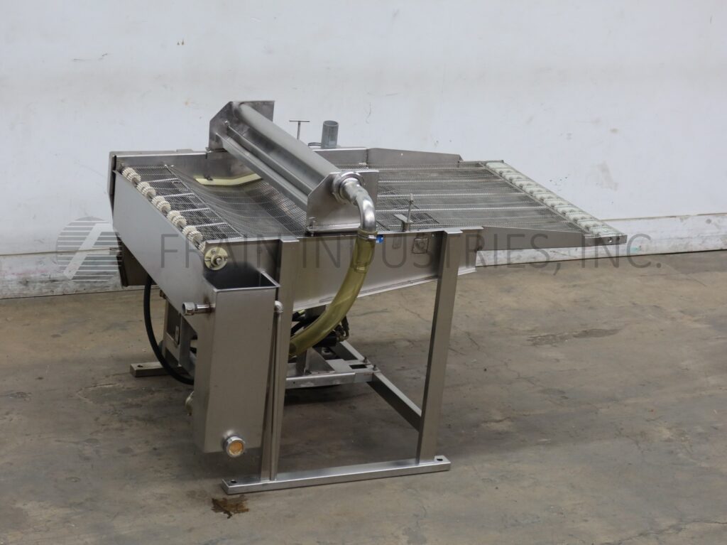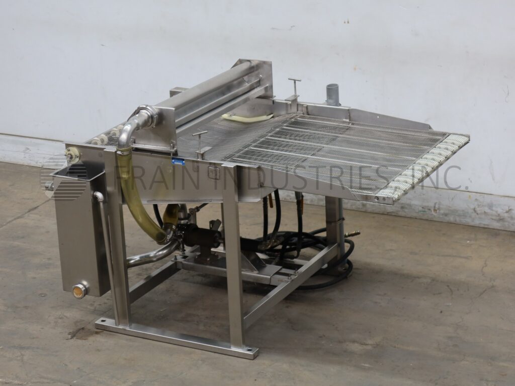 Stein, Model APB, stainless steel overflow batter applicator. For use with conventional pumpable batters. Products per minute – dependant on materials and application. Equipped with a 35" wide x 63" long stainless steel wire belt, 35" wide batter double curtain to coat top and sides of product, lowered belt section to coat bottom of product and batter pump. Mounted on a stainless steel base with casters.