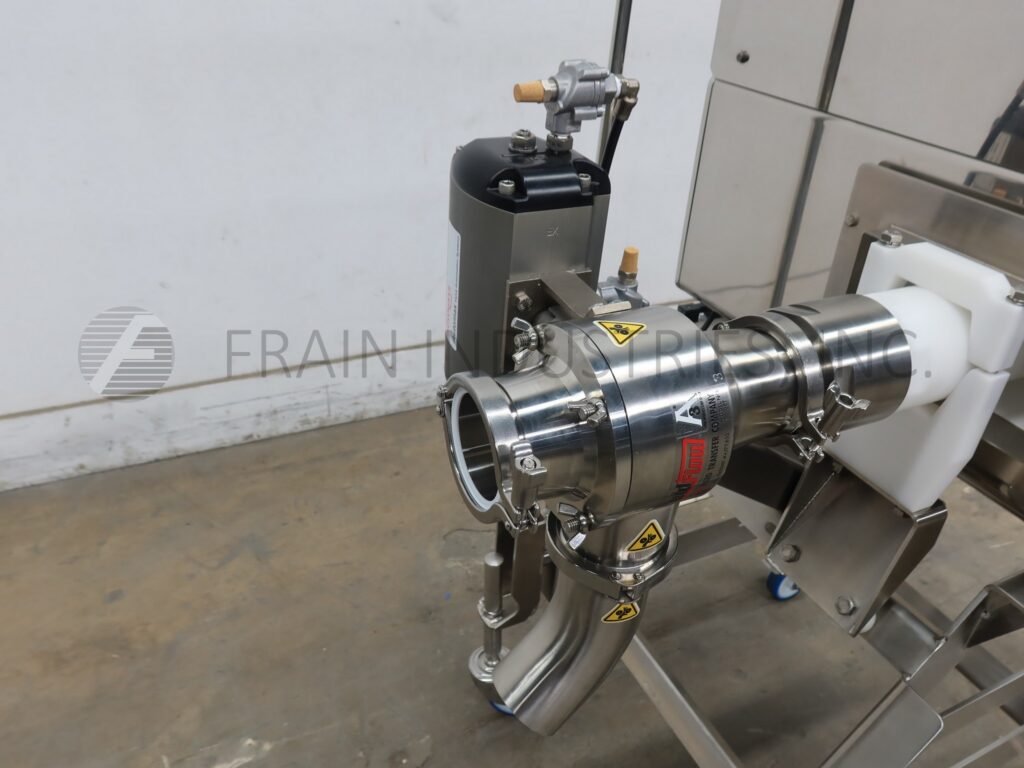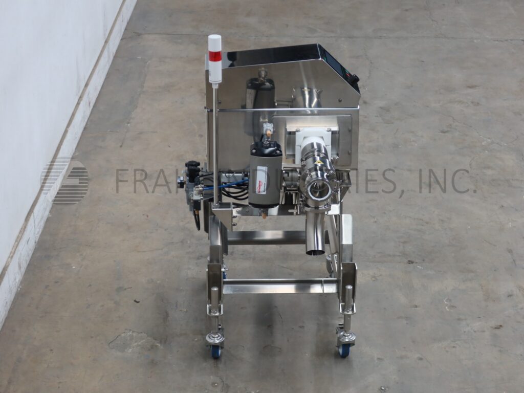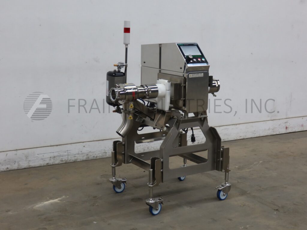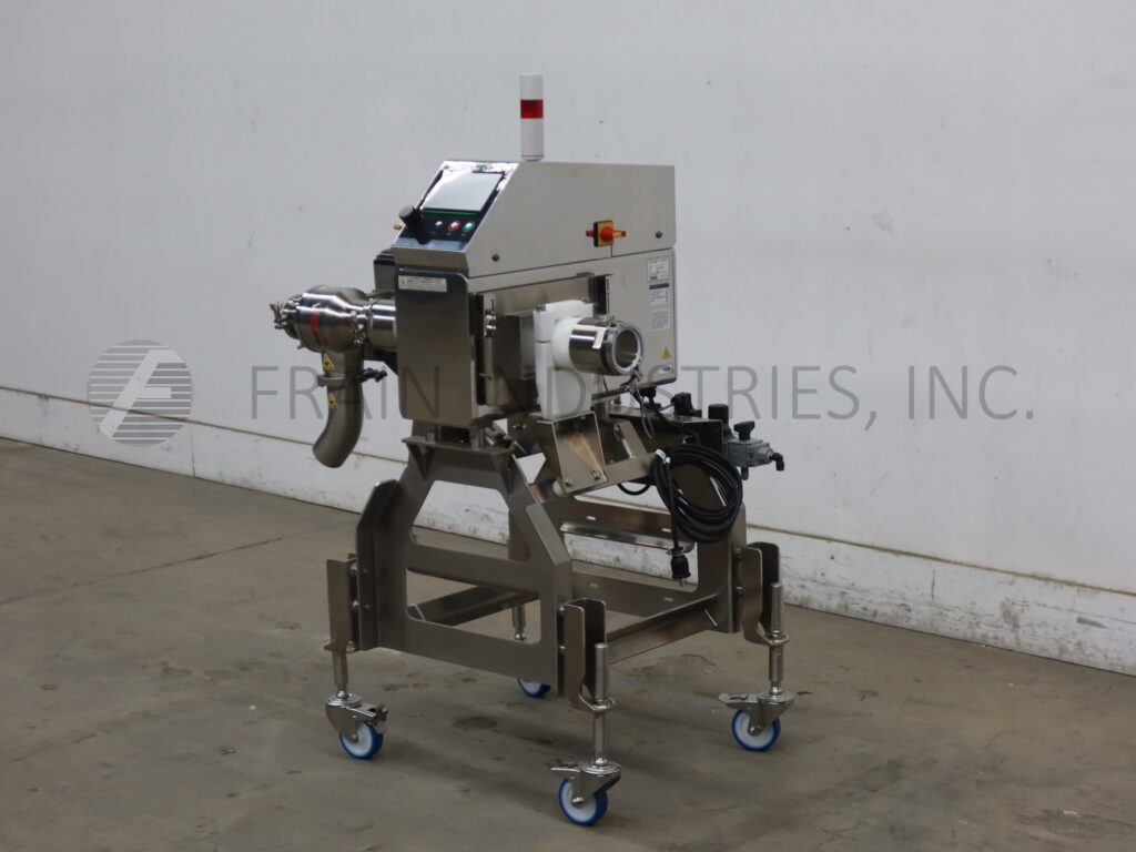 Anritsu, model KDS2110ANW PIPELINE, Stainless steel, pump feed metal detection system for products transported by pipeline. Volume of throughput per hour and Sensitivities – depending on materials, application, environment and machine configuration. Equipped with 8¼” x 4¾” aperture, 3½”OD / 3″ID Tri-clamp style connection and pneumatic diverting valve reject. Mounted on a stainless steel frame with locking casters.