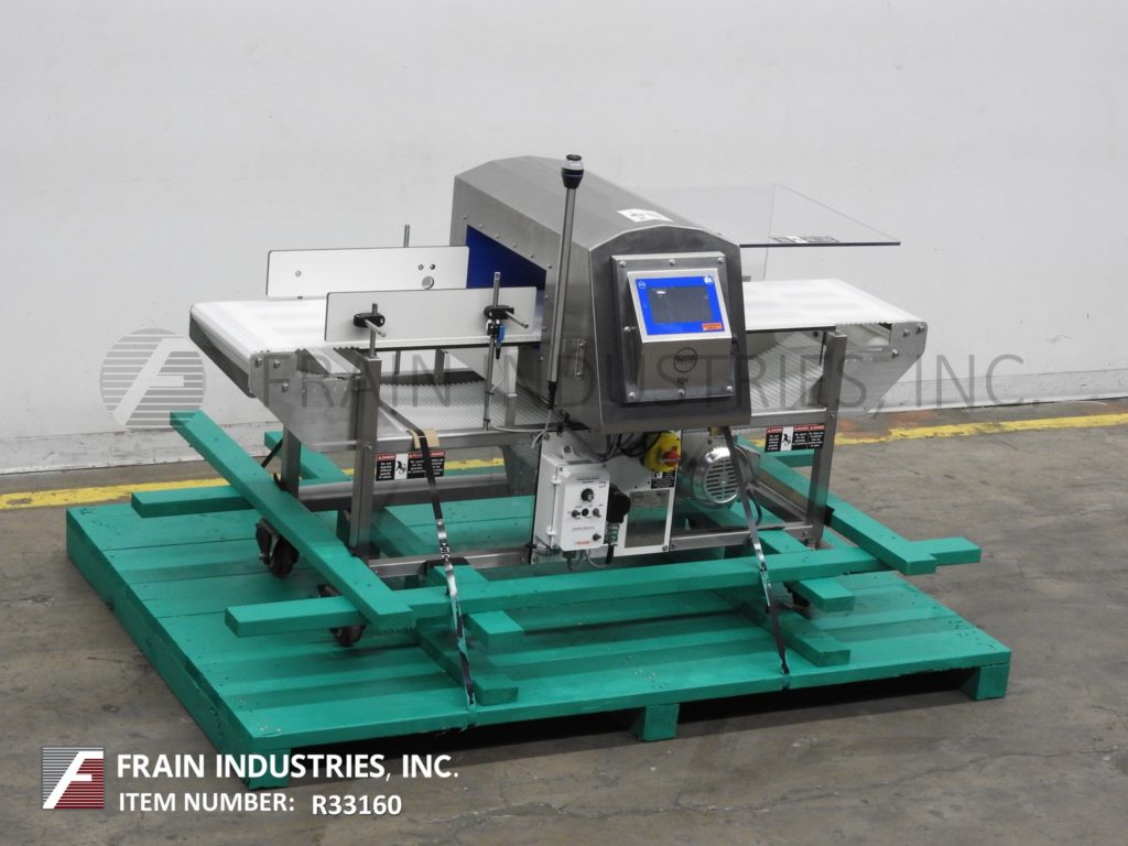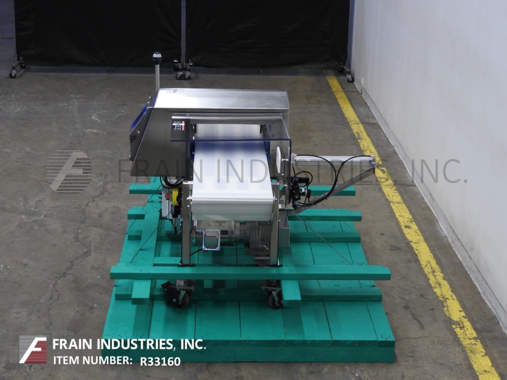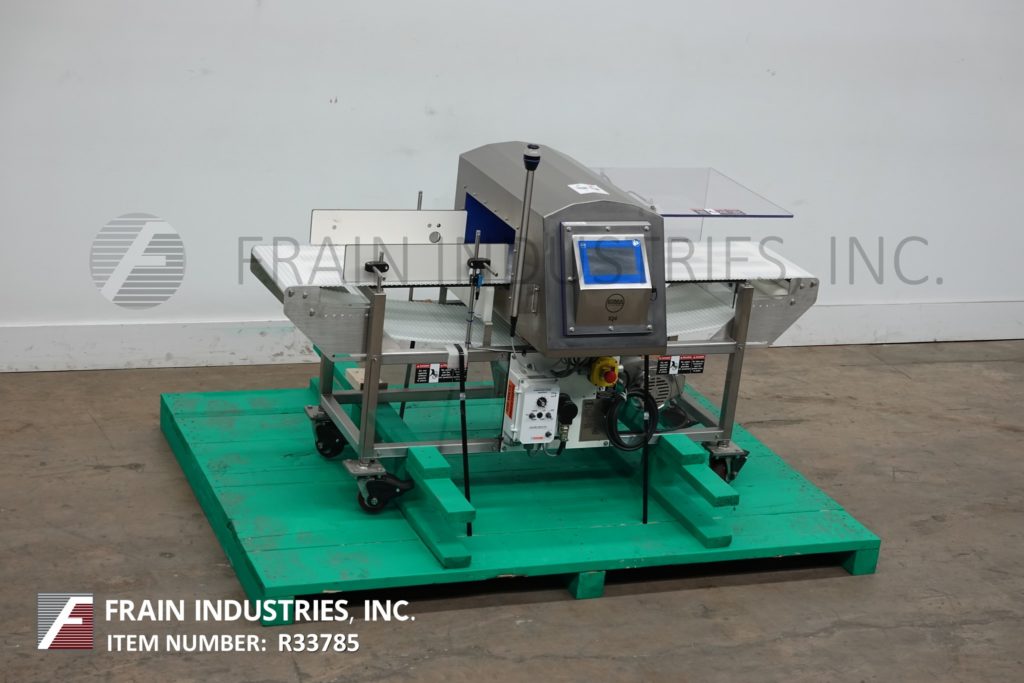 Loma, Model IQ4 touch screen, automatic, in line, stainless steel, metal detector with number of product per minute – depending on materials and application. 304 stainless steel construction. Total Aperture: 12" in Height; 21-1/2" in Width. Working Aperture: 10-1/2" in Height; 19-1/2" in Width. Equipped with 19-1/2" wide x 72" long Intralox product conveyor belt and is 34" to 38" adjustable in feed and discharge height, with ram arm reject, 7" color touchscreen controller with user interface, start, stop, e-stop push button controls and signal tower. Sensitivities: depending on product, container and environment being run in. Temperature range: -10 to +40 Deg C, 14 to 104 Deg F. Ethernet and USB capable. Mounted on stainless steel frame with height adjustable legs.