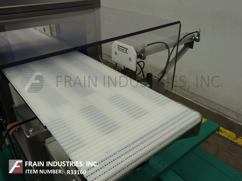 Loma, Model IQ4, automatic, in line, 304 stainless steel construction, metal detector rated from 0 to 120 feet per minute with number of product – depending on materials and application. Total Aperture: 6" in Height; 26" in Width; Working Aperture: 4-1/2" in Height; 23-1/2" in Width. Equipped with 23-1/2" wide x 72" long Intralox product conveyor with ram arm reject and safety guarding. Touch pad controls with display and variable speed controls. Sensitivities: depending on product, container and environment being run in. Temperature range: -10 to +40 Deg C, 14 to 104 Deg F. Ethernet and USB capable. Mounted on (4) leg stainless steel base frame with height adjustable leveling legs and safety guarding.