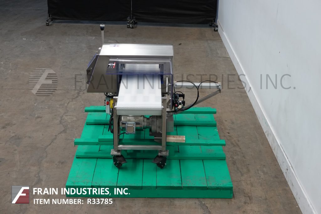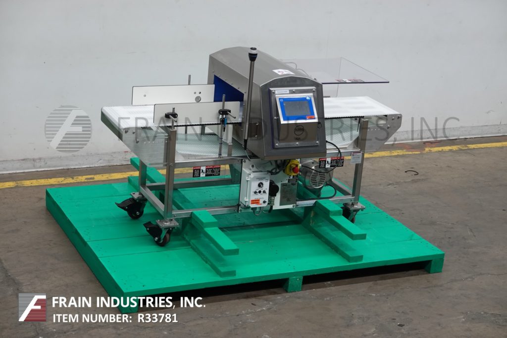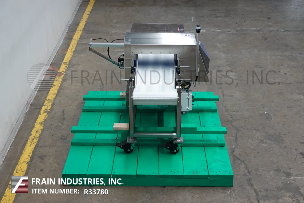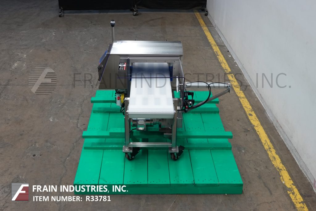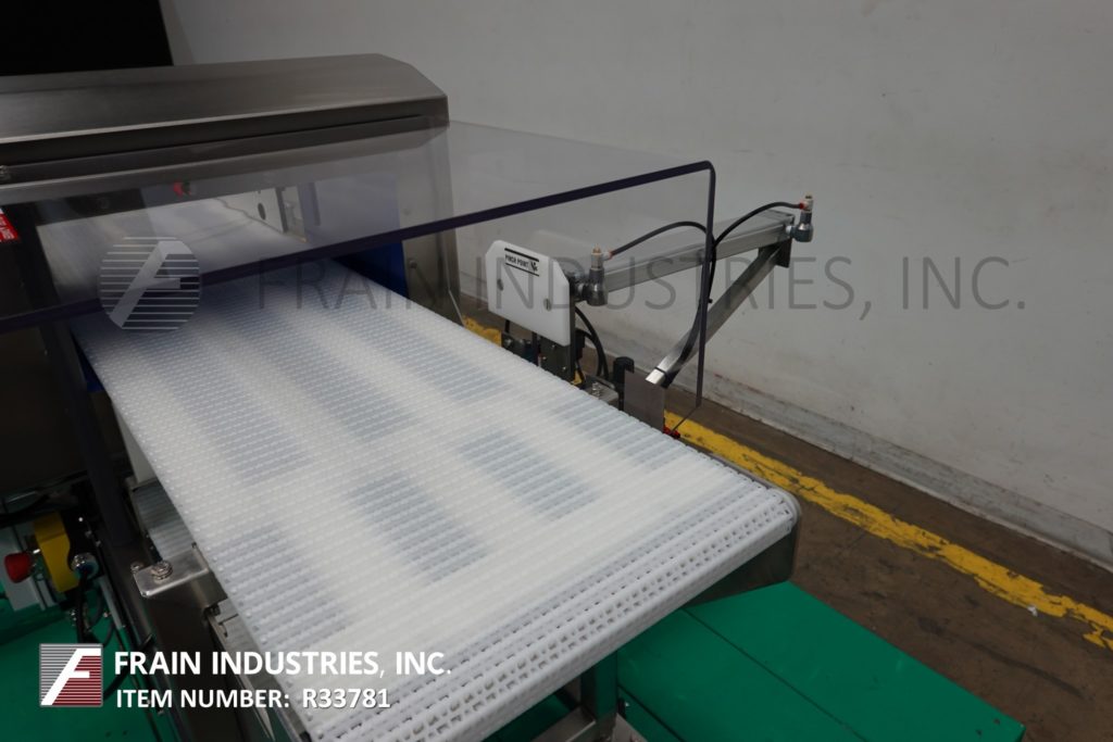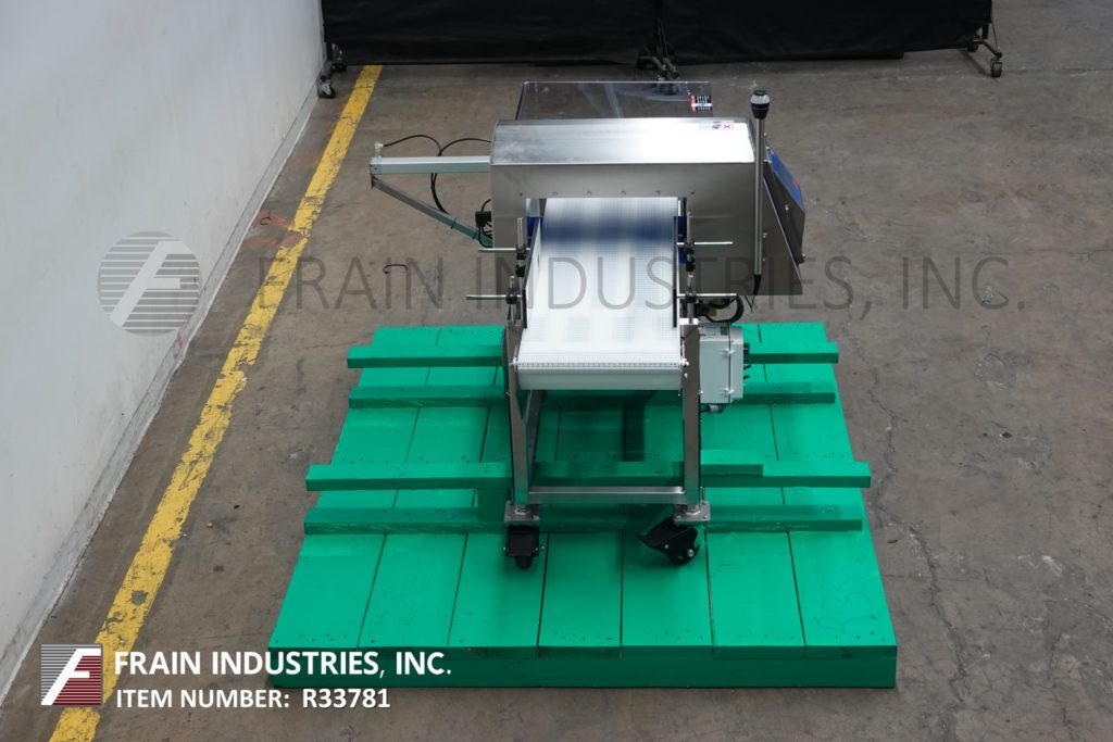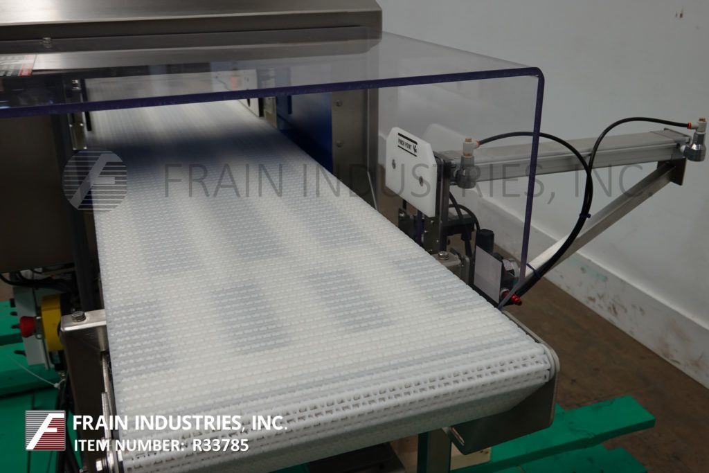 Loma, Model IQ4, Automatic, in line, stainless steel, metal detector with number of product per minute – depending on materials and application. 304 stainless steel construction. Total Aperture: 12" in Height; 21-1/2" in Width. Working Aperture: 10-1/2" in Height; 19-1/2" in Width. Equipped with 19-1/2" wide x 72" long Intralox product conveyor belt and is 34" to 38" adjustable in feed and discharge height, with ram arm reject, 7" color touch screen controller with user interface, start, stop, e-stop push button controls and signal tower. Sensitivities: depending on product, container and environment being run in. Temperature range: -10 to +40 Deg C, 14 to 104 Deg F. Ethernet and USB capable. Mounted on stainless steel frame with height adjustable legs.