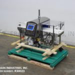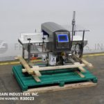 Safeline, Model PowerPhase Plus, automatic conveyor through metal detector with number of product per minute – depending on materials and application. Aperture: 2¼" in Height; 32¼" in Width. Equipped with 30" wide cleated inclined Intralox belt conveyor with 1½" high cleats set on 10" centers with an 8" infeed height and mechanical diverting chute reject with collection bin and 36" ground clearance. Sensitivities: depending on application and enviroment being run in.Control panel has touch pad operator interface and push button start / stop. Mounted on base frame with casters and lexan guarding.