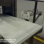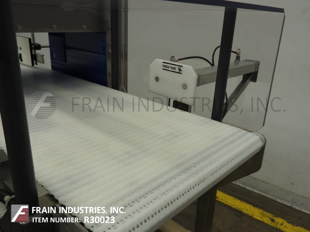 Safeline, Model STD, automatic metal detector. with number of product per minute – depending on materials and application. Working Aperture: 7½" in Height; 5" in Width. Equipped with a 12" long x 1" wide dual side belt transfer infeed conveyor, Model SL2000 52" long x 4" wide Intralox conveyor, system with stop belt reject, 12" long x 1" wide dual side belt transfer discharge conveyor. Sensitivities: depending on product, container and enviorment being run in. Touch pad operator interface with visual display. Mounted on stainless steel frame with leveling pads.